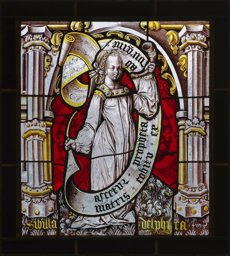 Barberi (2016, p. 100) a relevé que les représentations des dix Sibylles et des textes inscrits dans les phylactères se basent sur les prescriptions iconographiques dispensées dans l'opuscule “Sibyllarum et prophetarum de Christo vaticinia”, intégré au recueil imprimé à Rome en 1481 “Discordantiae sanctorum doctorum Hieronymi et Augustini” (https://gallica.bnf.fr/ark:/12148/bpt6k591531/f13.item). L’utilisation de ces représentations comme modèles pèse en faveur d’un cycle comprenant à l’origine non pas dix, mais douze Sibylles, puisque l’ouvrage représente deux prophétesses de plus que le cycle sur verre, celles de samienne et phrygienne.