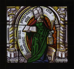 Ce vitrail fait partie d’un ensemble de dix panneaux réalisés à Aoste. Les représentations de ce cycle se rapportent aux prophéties messianiques énoncées par les Sibylles Tiburria, Lamya, Persica, Eritia, Delphica, Cymeria, Cumana, Europa, Agripina et Ellespontica (GE_2137 à GE_2146). Bien que la localisation de la série ne soit pas définie avec certitude, il est possible qu’elle ait formé un ensemble plus vaste avec les cinq vitraux liés à l’Incarnation de la chapelle du château d’Issogne (Elsig, 2014, p. 13), aujourd’hui conservés entre le Musée Ariana également (GE_2150 à GE_2152) et le Museo Civico d’Arte Antica de Turin (inv. 509, 305/VD et inv. 509, 306/VD).