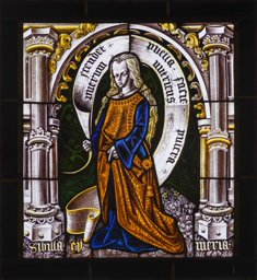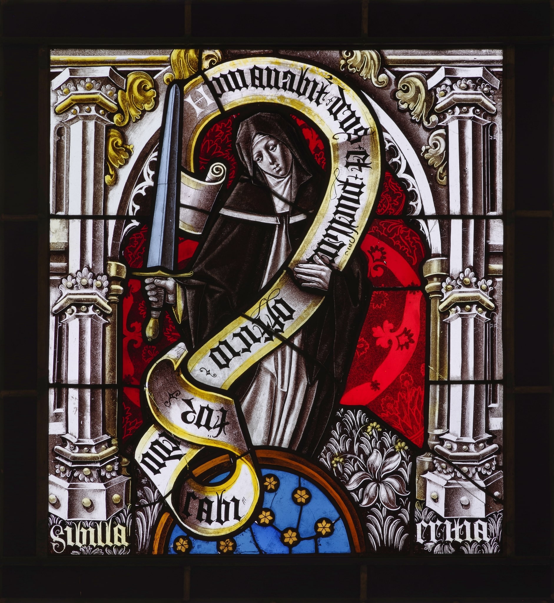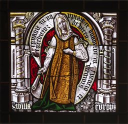 Vitrail représentant une femme en pied, portant un vêtement de religieuse, tenant une épée et portant un phylactère. Le personnage est placé dans un cadre architectural sous un arc brisé, sur un fond damassé et un sol tapis de végétaux, avec à ses pieds un demi cercle étoilé.