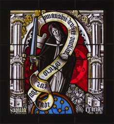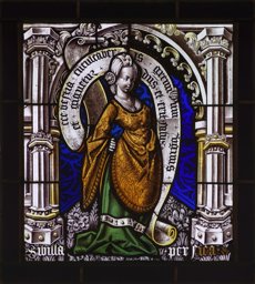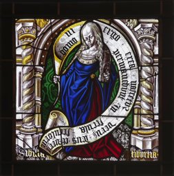 Vitrail représentant une vieille femme en pied, vêtue d'un costume du XVIe siècle et portant un phylactère. Le personnage est placé dans un cadre architectural sous un arc brisé, sur un fond damassé et un sol tapis de végétaux.