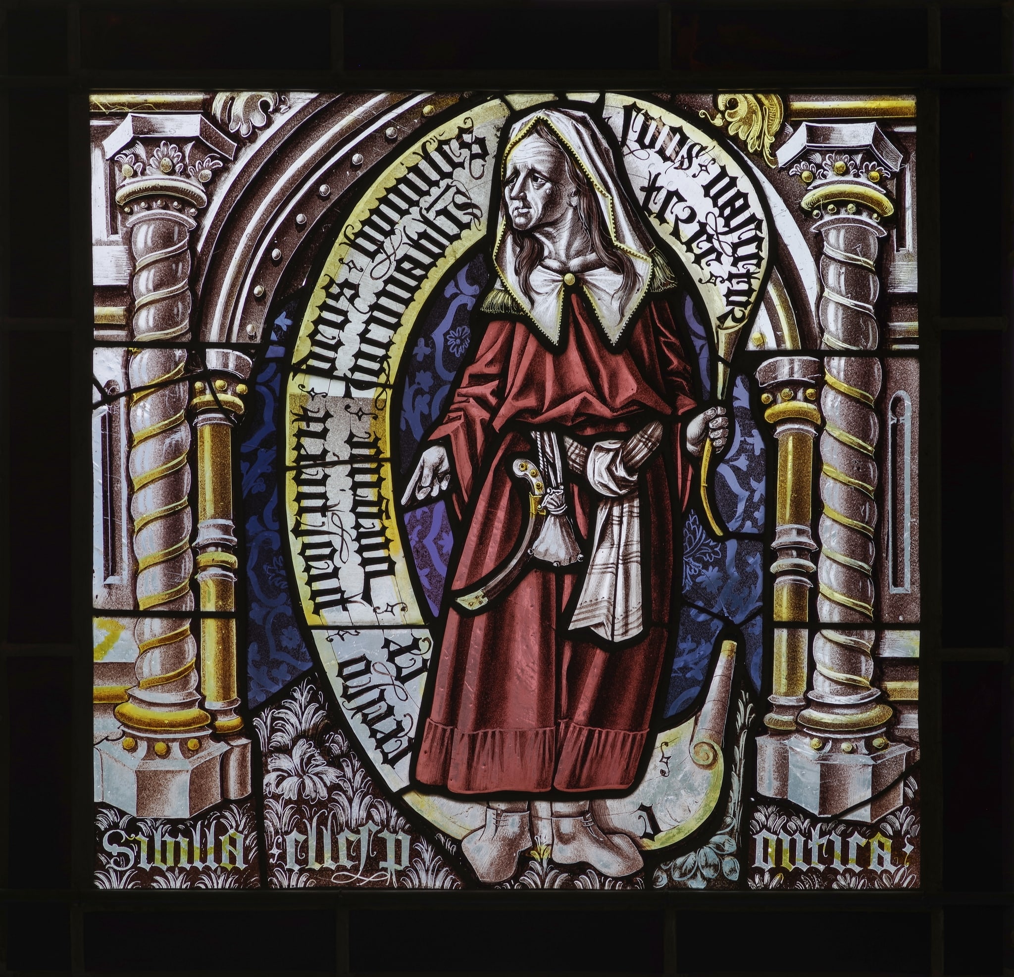 Barberi (2016, p. 100) a relevé que les représentations des dix Sibylles et des textes inscrits dans les phylactères se basent sur les prescriptions iconographiques dispensées dans l'opuscule “Sibyllarum et prophetarum de Christo vaticinia”, intégré au recueil imprimé à Rome en 1481 “Discordantiae sanctorum doctorum Hieronymi et Augustini” (https://gallica.bnf.fr/ark:/12148/bpt6k591531/f13.item). L’utilisation de ces représentations comme modèles pèse en faveur d’un cycle comprenant à l’origine non pas dix, mais douze Sibylles, puisque l’ouvrage représente deux prophétesses de plus que le cycle sur verre, celles de samienne et phrygienne.