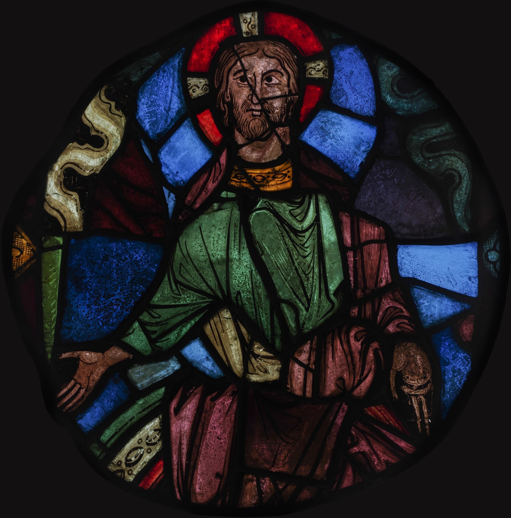 Médaillon recomposé représentant au centre le Christ avec un nimbe crucifère siégeant sur un arc-en-ciel formé de courbes verte, blanche et rouge. Les bras tendus vers le bas, il effectue un geste de bénédiction de la main gauche (placée à l’envers et du mauvais côté). Le fond, composé de fragments disparates anciens, présente de part et d’autre de la tête du Christ des nuées.