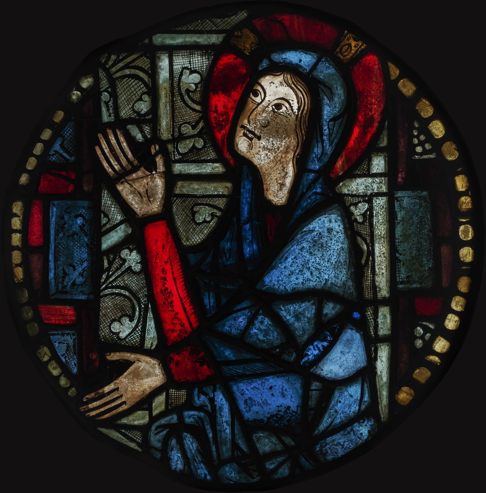Le présent vitrail a été remanié et comporte de nombreuses pièces de remploi, parmi lesquelles se trouvent peut-être le fond composé de motifs végétalisants. La posture et la figuration à une plus grande échelle de Marie incitent à y voir une représentation de la Vierge intercédant pour les hommes, son regard et sa main droite tournés vers le Christ et sa main gauche désignant les ressuscités (Lafond, 1948, p. 118 ; Raguin, 1985, p. 75). Elle était peut être à l’origine disposée en regard d’un Christ en gloire, parmi une sélection de saints (Raguin, 1985, p. 75). Le médaillon pourrait ainsi être issu d’une verrière du Jugement dernier.