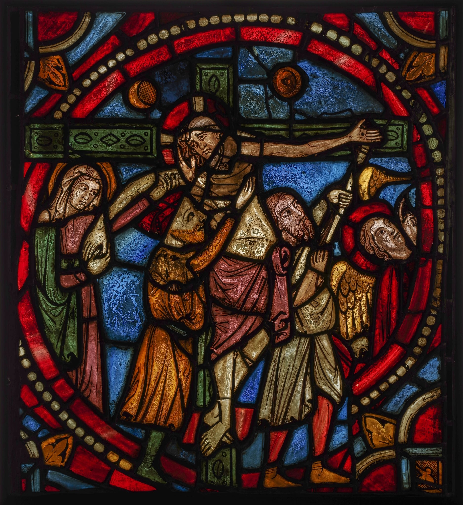 Le présent vitrail du Calvaire faisait à l’origine partie d’une baie dédiée à la Passion, tout comme les épisodes du Lavement des pieds (GE_2157), du Baiser de Judas (GE_2162) et de la Flagellation du Christ (GE_2163). Les nombreuses traces de réparation, de remaniements et les singularités iconographiques ont amené Raguin (1985, p. 71 et 73) à envisager cette verrière comme un assemblage, combinant les scènes de la Crucifixion et de la Déposition. Ces deux épisodes apparaissent souvent séparément dans les baies de la Passion, comme à Bourges ou à Chartres. Selon elle, cette fusion pourrait être le résultat d’une intervention du XVe siècle, vouée à conserver ces deux panneaux alors fragmentaires, tout en gardant un maximum de cohérence (Raguin, 1985, p. 71). Selon Lafond (1948, p. 125), l’ange inséré à droite pourrait provenir d’un vitrail disparu de l’Annonciation, placé à l’origine dans la baie consacrée à la Vie de la Vierge. Compte tenu du geste qu’il effectue avec la main, il devait se tenir dans la partie gauche de la verrière, tandis que la Vierge Marie devait se tenir à droite (Raguin, 1985, p. 73).