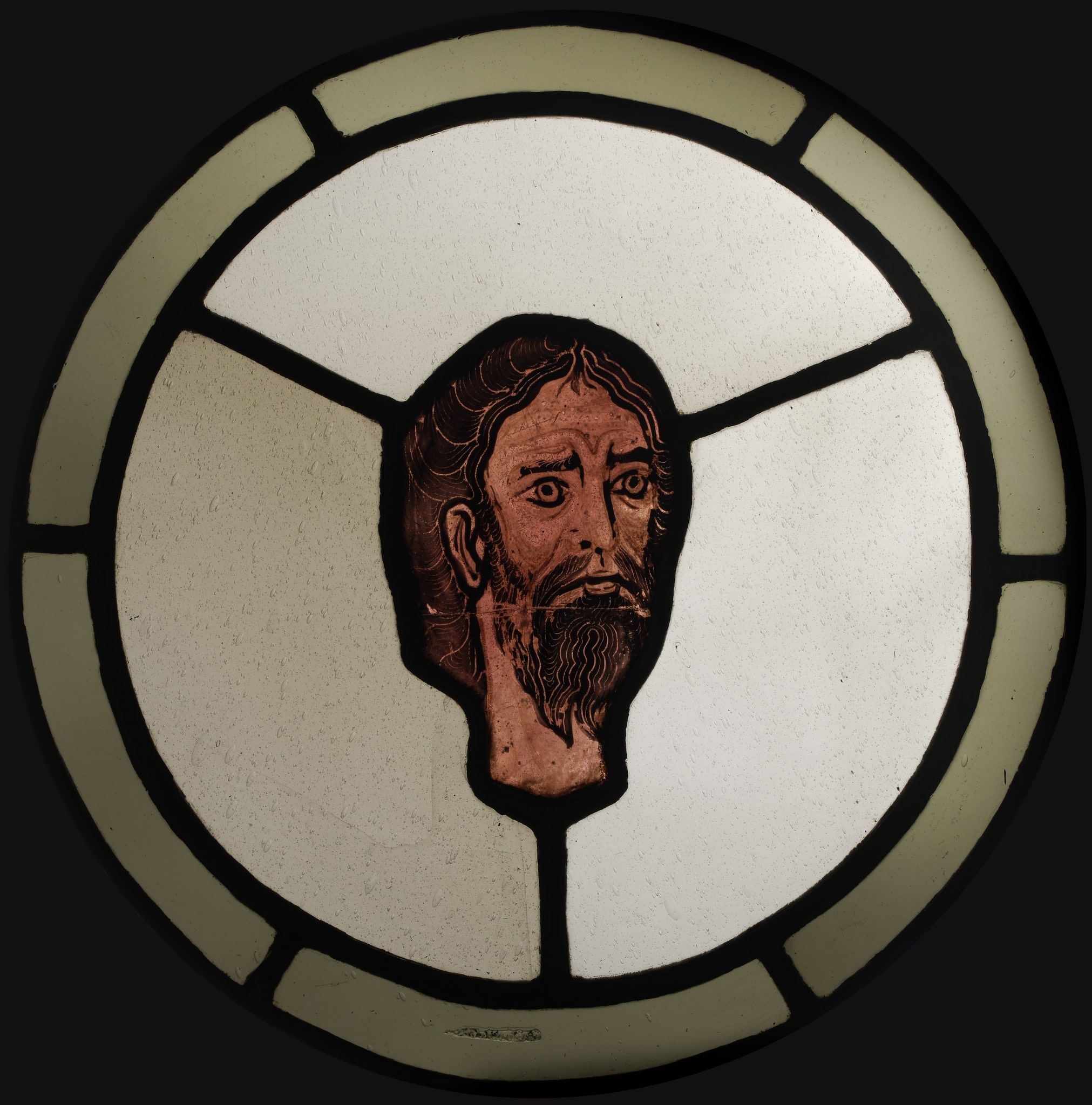 Fragment de vitrail représentant de trois quarts la tête d’un personnage barbu et moustachu, traditionnellement interprété comme le Christ ou saint Jean-Baptiste. Il est encadré de verres incolores modernes.