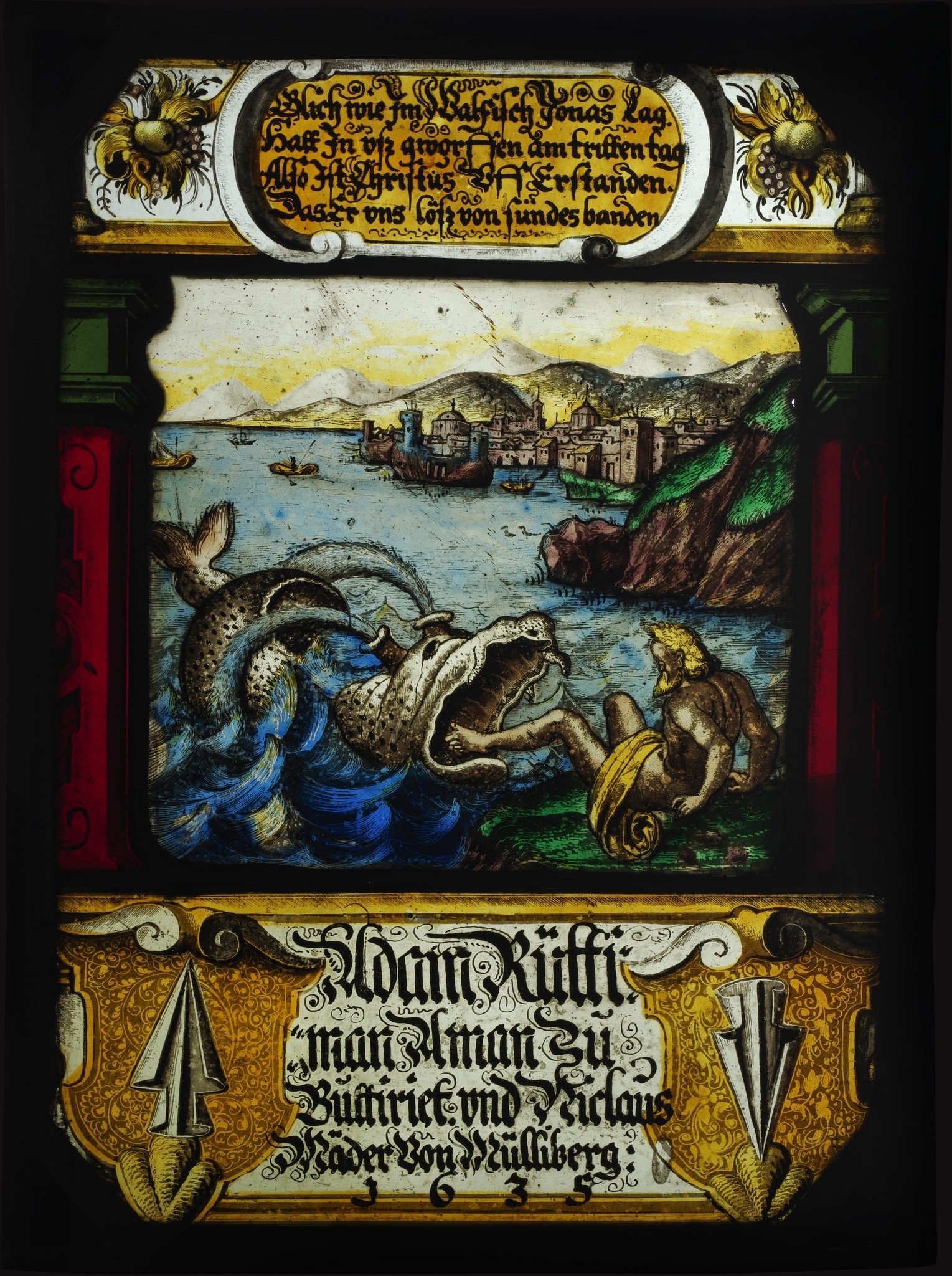 D’un point de vue stylistique, les trois vitraux de l’Ariana sont indéniablement de la main d’un même peintre verrier. Tout comme ceux cités précédemment, ils pourraient être attribués au maître bernois Matthias Zwirn (†1681), actif dès 1630 (Bergmann, 2014, p. 899). Ce peintre verrier a souvent utilisé comme modèles des gravures sur cuivre réalisées puis éditées vers 1625-1630, tirées des Icones Biblicae de Matthäus Merian l’Ancien (1593-1650). La représentation de Jonas et la baleine ne fait pas exception. Bien que la représentation s’écarte en plusieurs points de l’estampe de Merian, quelques éléments, tels que la queue en tire-bouchon de la baleine ou encore le paysage côtier figuré en arrière-plan, reprennent avec exactitude ce modèle.