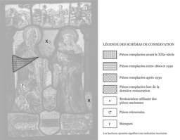 Avers fortement abrasé et corrodé, quelques fentes, quelques plombs de casse, quelques compléments (fond central supérieur, manche droite de saint Martin), lacune au niveau de la tête de l’estropié, deux anneaux d’accrochage en plomb soudés dans les angles supérieurs du cadre (avers), marque de cuisson “o”.