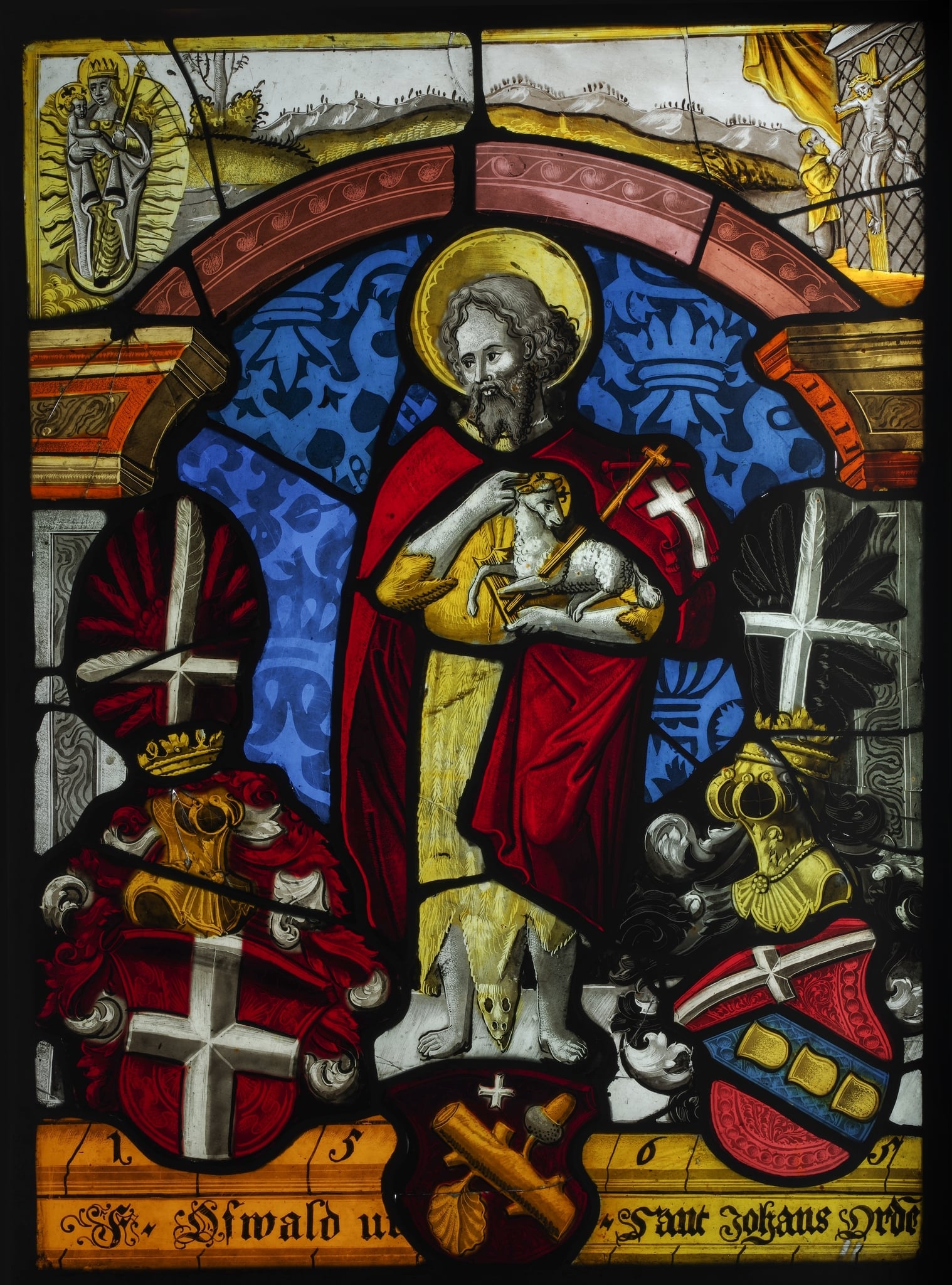 Le panneau accorde une place centrale à la figure de saint Jean-Baptiste en tant que patron de l’Ordre de Saint-Jean. Il a été donné en 1565 par l’ecclésiastique Oswald Elsener (†1565) et le commandeur Joseph von Cambiano, dont les écus armoriés apparaissent sur le vitrail couplés à l’emblème héraldique de l’Ordre de Saint-Jean (cf. Schnyder, 1961, p. 32, 37-38, 42). Joseph von Cambiano (aussi dit Cambia ou von Campione) est probablement issu de la famille des seigneurs de Ruffia, originaire du Piémont, dont plusieurs membres ont été chevaliers de Saint-Jean de Jérusalem (Z. B., 1960, p. 27). De 1542 à 1570, il est commandeur de Reiden et Hohenrain dans le canton de Lucerne. En 1563, il devient ministre de l’Ordre à Rome et participe en 1565 à une bataille navale contre les Turcs (Hasler, 2002, p. 145). Souvent absent en raison de ses fréquents déplacements, il nomme gouverneurs des commanderies lucernoises de Reiden Johann Hürlimann et de Hohenrain Oswald Elsener, co-donateur du présent panneau (Hasler, 2002, p. 145-146). Né à Menzingen (ZG) à une date inconnue, ce dernier pourrait être issu de la famille paysanne du même nom, reçue bourgeoise de Zoug en 1570 (Morosoli, 2009). Il a occupé la fonction de gouverneur de la commanderie de Hohenrain de 1544 jusqu’à sa mort (Hasler, 2002, p. 145).