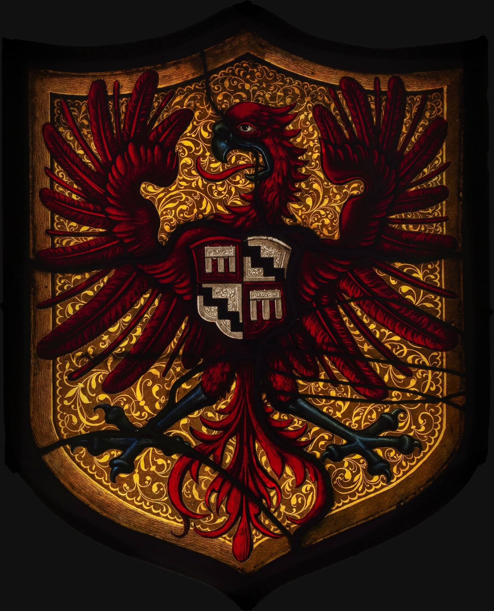 Sur un fond damassé jaune, un aigle est représenté de face, ses ailes ouvertes et plumes déployées. Sa tête de profil regarde à droite. Il se présente avec le bec ouvert et une langue rouge tirée. Il a des pattes dégarnies bleues et une queue aux plumes déployées rouges. Des armoiries non identifiée sont représentées sur son torse.