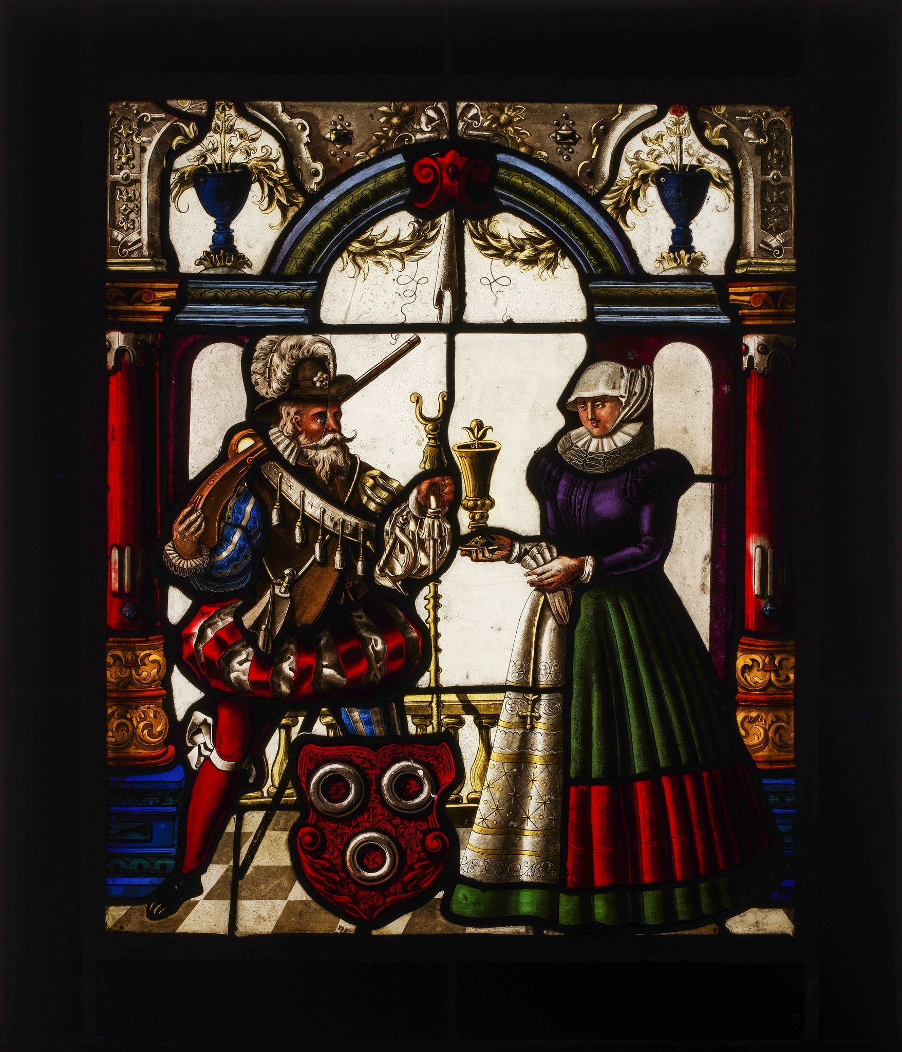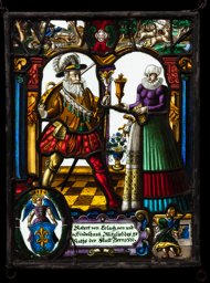 Le couple de donateurs se tient sur une estrade carrelée, devant une balustrade, en costume de fête sur un fond incolore, alors que les armoiries de l’époux sont disposées devant lui. Il est coiffé d’un chapeau à plumes, porte une cartouchière posée sur son épaule et se présente avec son arquebuse à l'épaule, tenant une fourche à sa gauche. La femme lui présente une coupe. Elle est vêtue d’une longue robe à manches, porte une fraise et une coiffe blanche ainsi qu’une croix au bout d’un cordon attaché à sa taille. Deux colonnes soutiennent un entablement bleu composé d’un arc en plein cintre sur lequel sont disposés deux vases fleuris desquels partent une guirlande de feuilles.