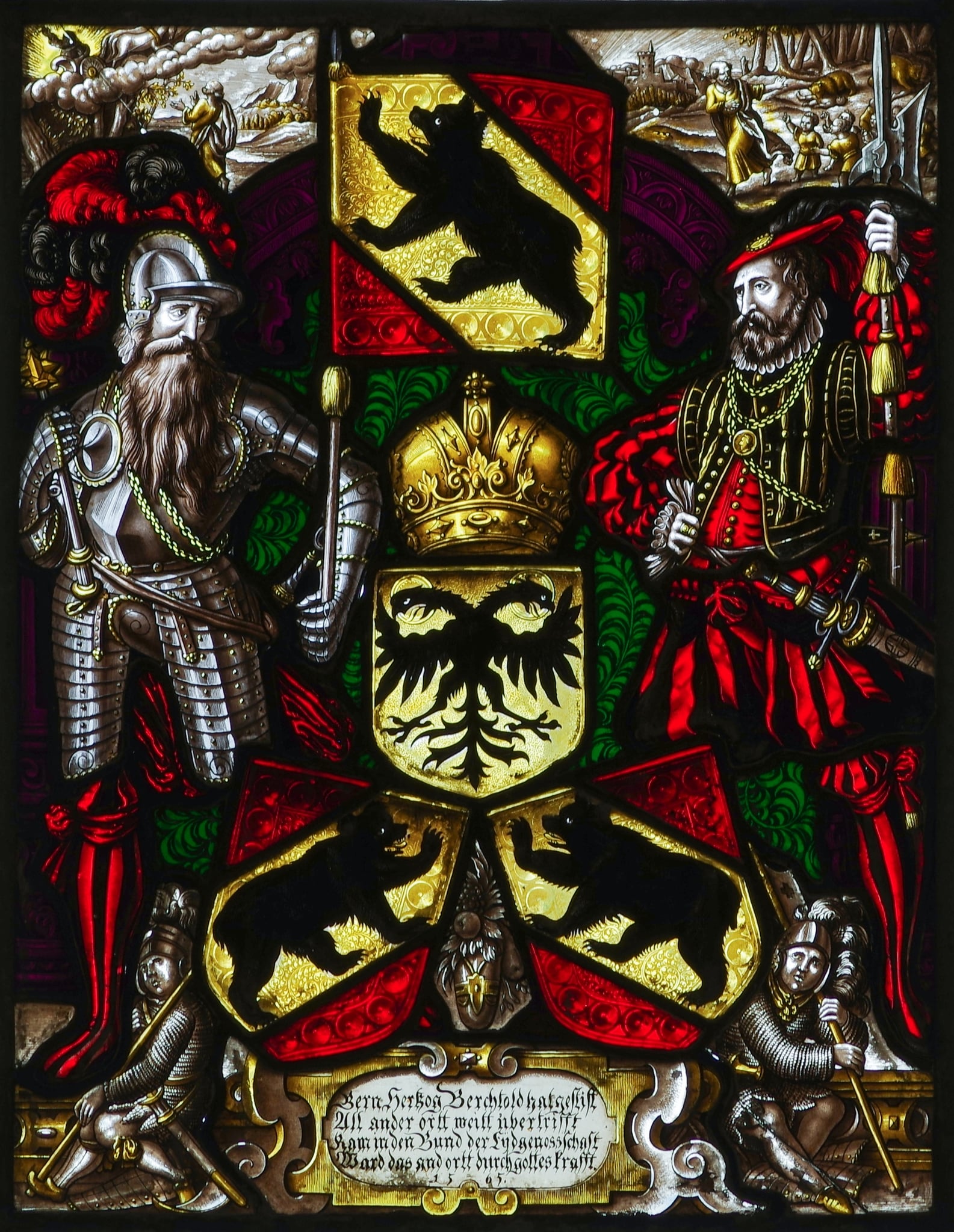 Sur un fond damassé vert, un banneret et un hallebardier barbus encadrent trois écus aux armes de Berne et du Saint-Empire présentés en pyramide, surmontés d’une couronne et flanqués de deux enfants en tenue militaire suisse, assis de part et d’autre de la pyramide, s’appuyant sur leur hallebarde. Le banneret à gauche est vêtu d’une demi-armure et coiffé d’un casque, alors que le hallebardier à droite est habillé d’une chemise aux manches bouffantes et de collants rayés et chapeauté d’un béret à plumes. Tous deux portent à leur ceinture une épée à main et le banneret tient un gourdin de sa main droite. Dans l’écoinçon en haut à gauche, le prophète Élysée assiste à l’ascension d’Élie emporté dans un chariot de feu montant au ciel, alors qu’à droite Élysée se retourne vers des enfants se moquant de lui et qu’à l’arrière-plan deux ours sortant du bois, déchirent deux corps d’enfants.