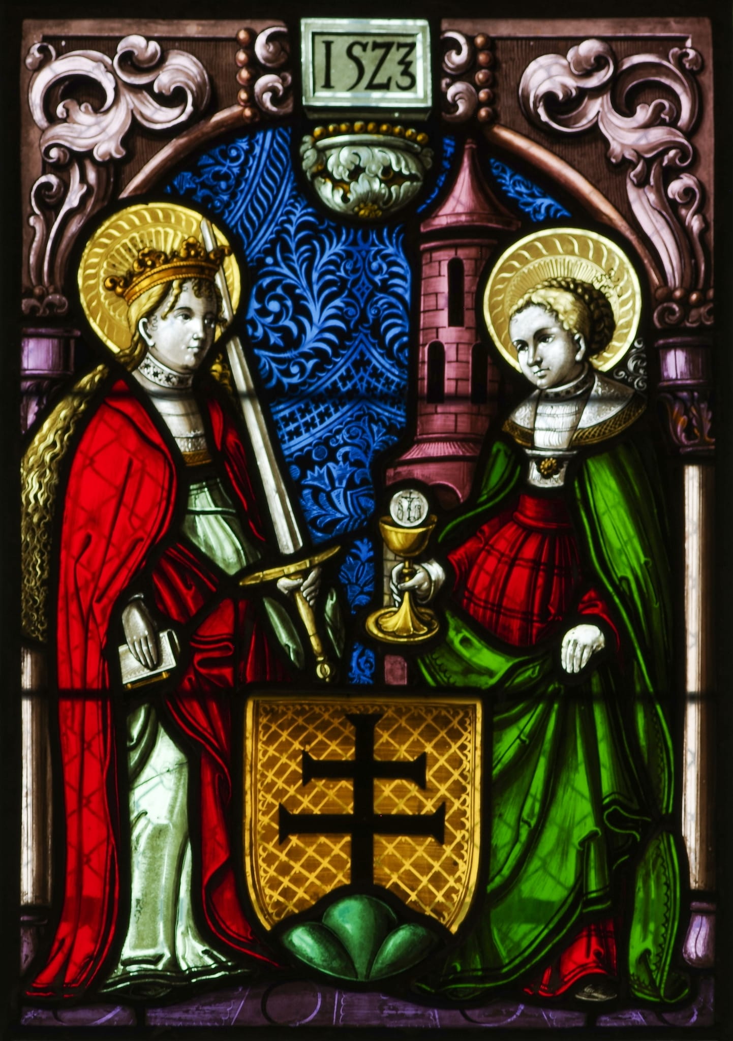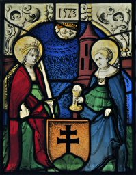 Sur un fond damassé bleu, deux saintes femmes nimbées et en pied sont placées de part et d'autre d’armoiries, peut-être celles du cloître de Königsfelden. La sainte à gauche, portant une couronne, une épée et un livre peut être identifiée à Catherine, bien que son attribut distinctif principal, la roue, ne soit pas présent. La sainte qui lui fait face est sainte Barbe, identifiée grâce à la tour qui apparaît derrière elle et au calice surmonté d'une hostie qu'elle tient à la main. Au-dessus de deux chapiteaux rouges se trouve un arc en plein cintre dont les surfaces murales sont recouvertes de rinceaux. Au-dessus de la clé de voûte suspendue, une plaque indique la date de la fondation. L'encadrement architectural est composé de fines colonnes et d'un arc surbaissé rose orné de deux écoinçons décorés de feuillages. Au-dessus de la clef de voûte apparaît la date dans un cartouche.