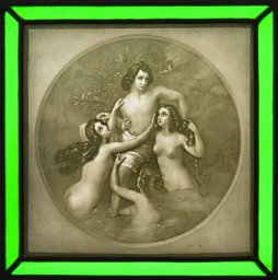 Le deuxième à gauche illustre dans un médaillon une scène de nus. Un jeune homme assis au bord de l’eau est entourés de trois jeunes femmes.