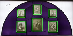 Quatre panneaux en lithophanie sont inscrits dans un vitrail au plomb en plein cintre, chacun d’entre eux étant encadré de verre vert sur un fond violet.