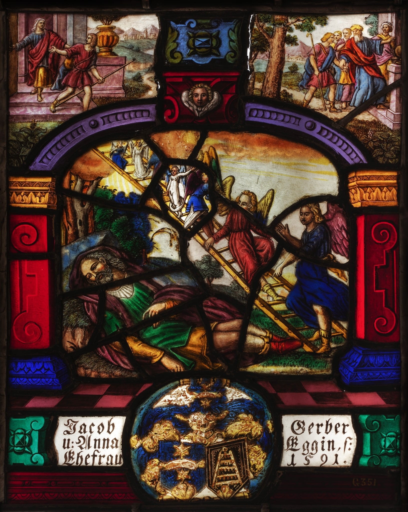 Vitrail rectangulaire représentant au centre le songe de Jacob avec l’homme endormi et en diagonale l’échelle traversée par des anges qui vont et viennent, sous un cadre architectural composé de deux piliers soutenant un arc en anse de panier dont le sommet est décoré d’une tête d’ange ailée. Les écoinçons représentent à gauche Jacob quittant Isaac et à droite Jacob accueilli par Laban et ses filles. Dans le soubassement se trouve un cartouche comportant une inscription des donateurs, séparé en son centre par un petit médaillon figurant les armoiries du couple accolées et surmontées d’un heaume empanaché.