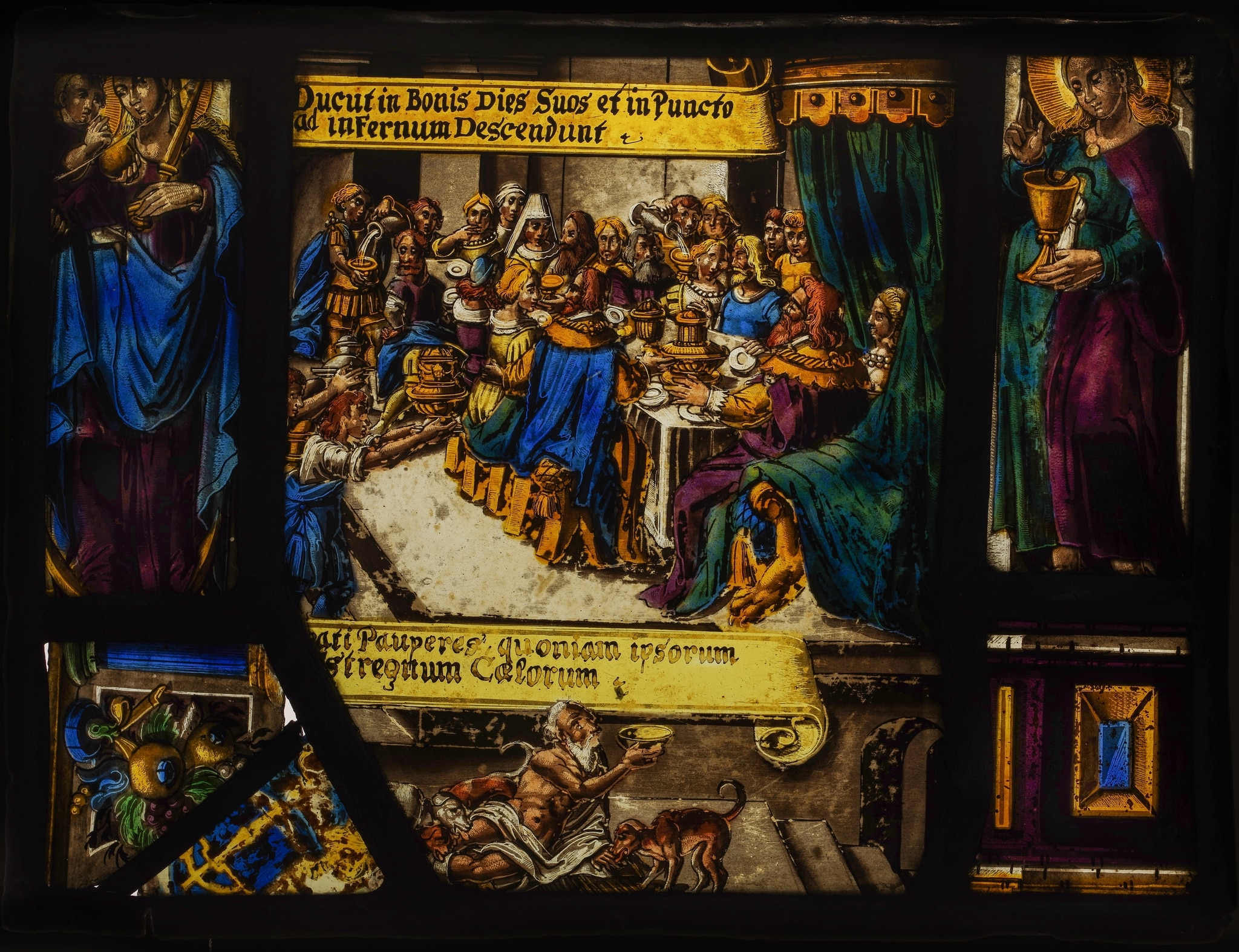 Fragment de vitrail héraldique, dont les armes ont été perdues, représentant la parabole du riche et de Lazare. Au centre, des personnages richement vêtus festoient autour d’une grande table. Au dessous, le pauvre Lazare, mourant de faim, tend une coupe dans leur direction, tandis que des chiens lèchent les ulcères sur ses bras et ses jambes. De part et d’autre figurent devant des piliers la Vierge à l’Enfant sur un croissant de lune et saint Jean bénissant un calice d’où sort un serpent.
