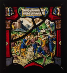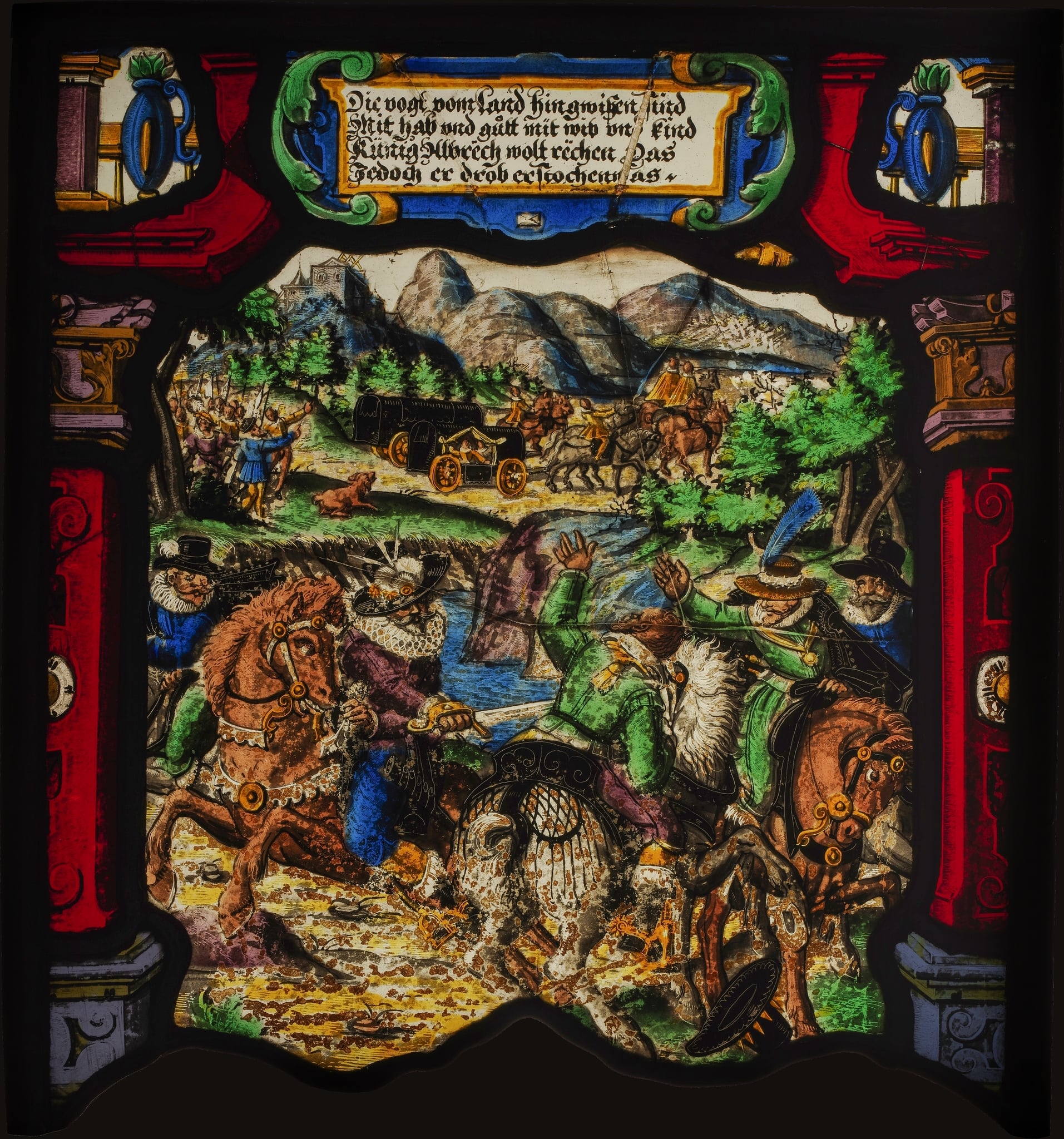 Ce vitrail forme un ensemble avec les panneaux GE_2277, GE_2278 et GE_2279. La série, aujourd’hui sans doute dispersée ou incomplète, représente des épisodes de l’histoire de la fondation de la Confédération suisse. Le présent vitrail figure une scène issue de la légendaire histoire du roi Albert Ier de Habsbourg. Alors qu’il a refusé à son neveu, Jean, l’héritage qu’il revendiquait, ce dernier l’assassine avec l’assistance des barons Rudolf II von Balm, Walter IV von Eschenbach et Rudolf von Wart (Hälg-Steffen, 2001).