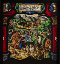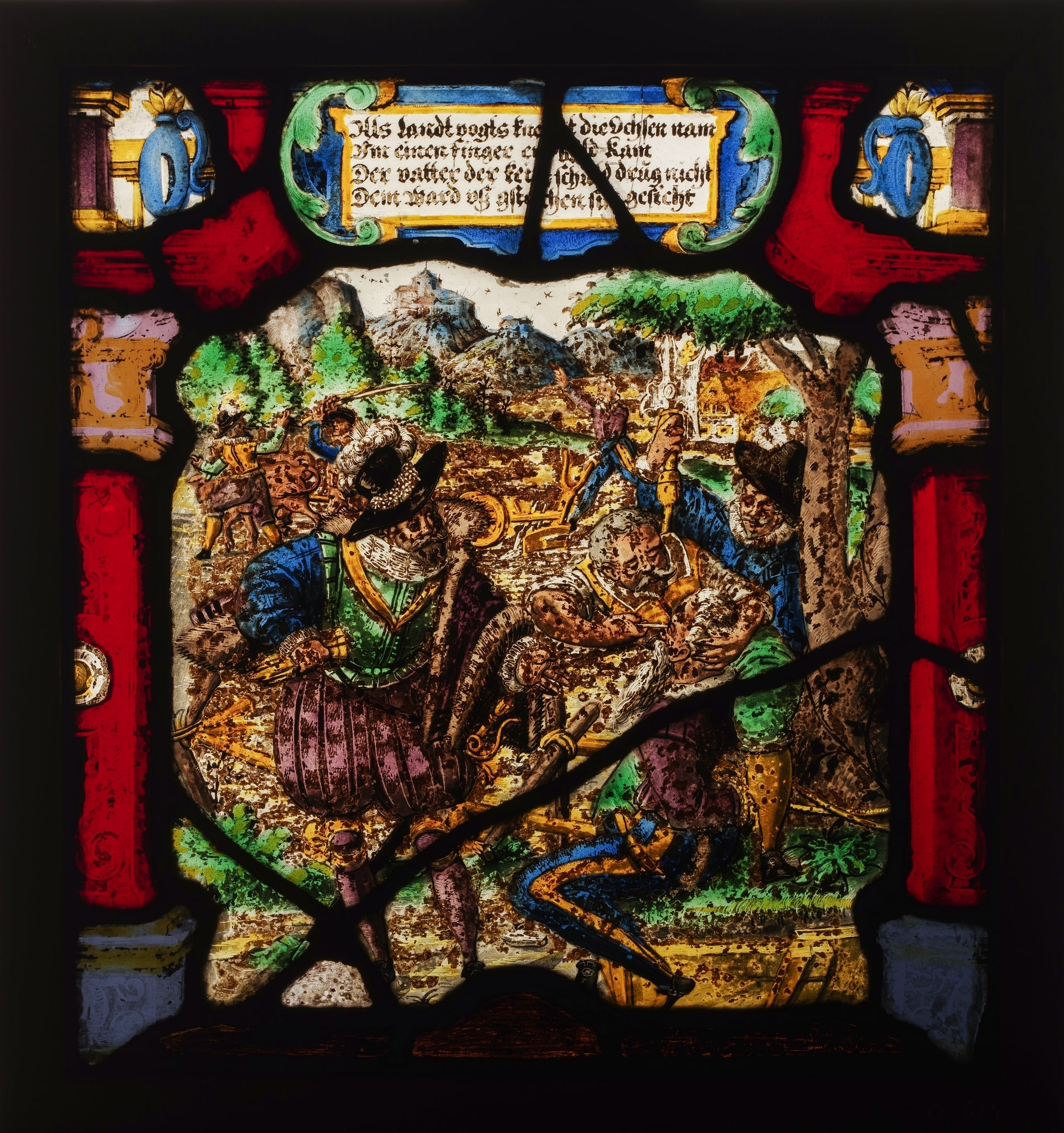 Ce vitrail forme un ensemble avec les panneaux GE_2276, GE_2278 et GE_2279. La série, aujourd’hui sans doute dispersée ou incomplète, représente des épisodes de l’histoire de la fondation de la Confédération suisse. Le présent vitrail figure une scène issue de la légendaire histoire du personnage fondateur de la Confédération helvétique, Arnold von Melchtal (Flüe, 2009). Alors que l’un des hommes du bailli de Landenberg tente d’emmener ses boeufs, Arnold use de la force afin de l’en empêcher. Les représailles du bailli ne se font pas attendre : le père d’Arnold se fait crever les yeux par les hommes du bailli et ses biens sont saisis.