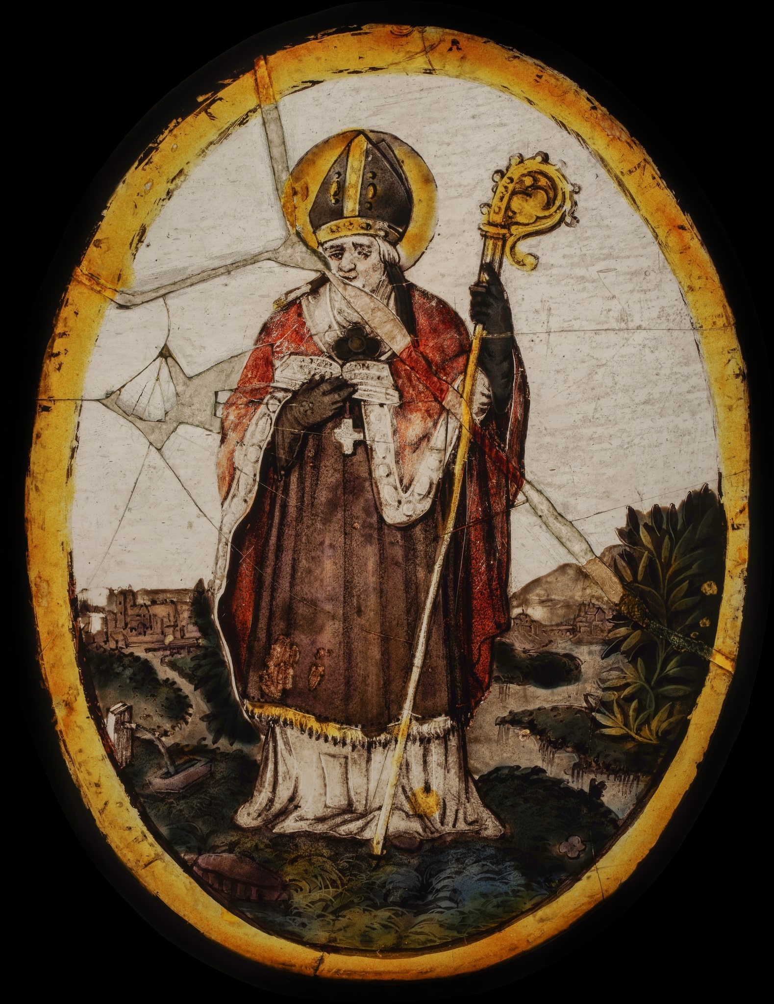 Le saint évêque représenté, tout comme le peintre verrier ne sont pas identifiés. Au XVIIe siècle, les médaillons monolithes ovales figurant des saints ou des scènes bibliques sont particulièrement répandus dans les Pays-Bas (cf. Berserik & Caen, 2011, vol. 2, p. 52-53) et dans le sud de l’Allemagne (cf. Husband, 1991, p. 83). Compte tenu du style, de la technique et du format, l’ensemble des vitraux (GE_2293 à GE_2297) acheté en 1892 à A. Bussien (fils) au Bouveret en Valais semble provenir de ces régions.