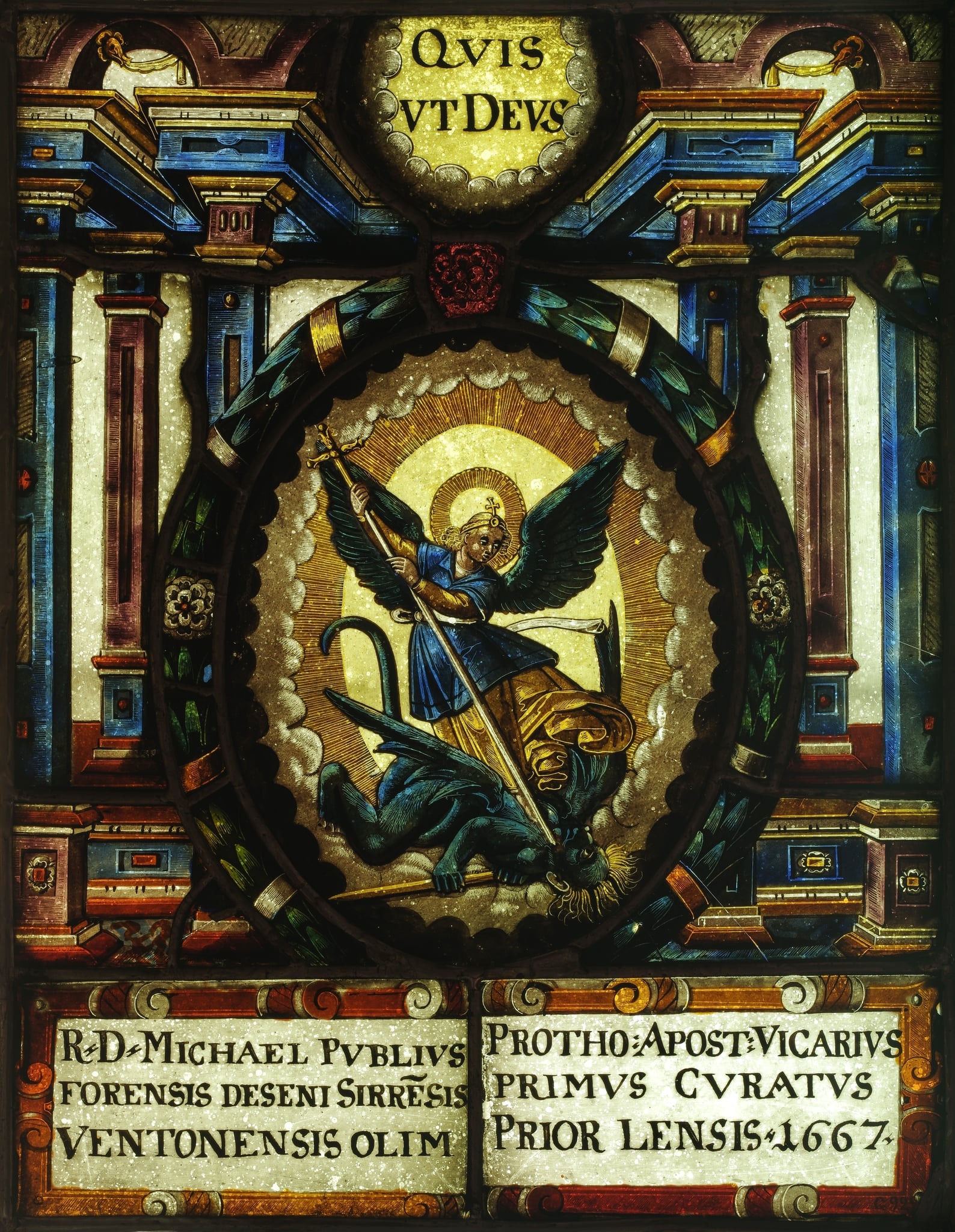 Ce panneau est le pendant du vitrail aux armes de Michel Publius (GE_2303), également conservé au Musée d’art et d’histoire de Genève. Ils ont été commandés en 1667 par Michel Publius († vers 1677/1680) en tant que protonotaire apostolique, doyen du dizain de Sierre, premier curé de Venthône et ancien prieur de Lens, en Valais, comme l’indiquent les inscriptions au bas des panneaux. Son testament signale qu’il est originaire du canton de Fribourg (CH AEV, AB Venthône, Pg 29). La représentation de Michel terrassant le dragon et l’inscription latine “Quis ut Deus” (”Qui égale Dieu”, traduction littérale du nom Michel en hébreu) font références au nom du donateur.