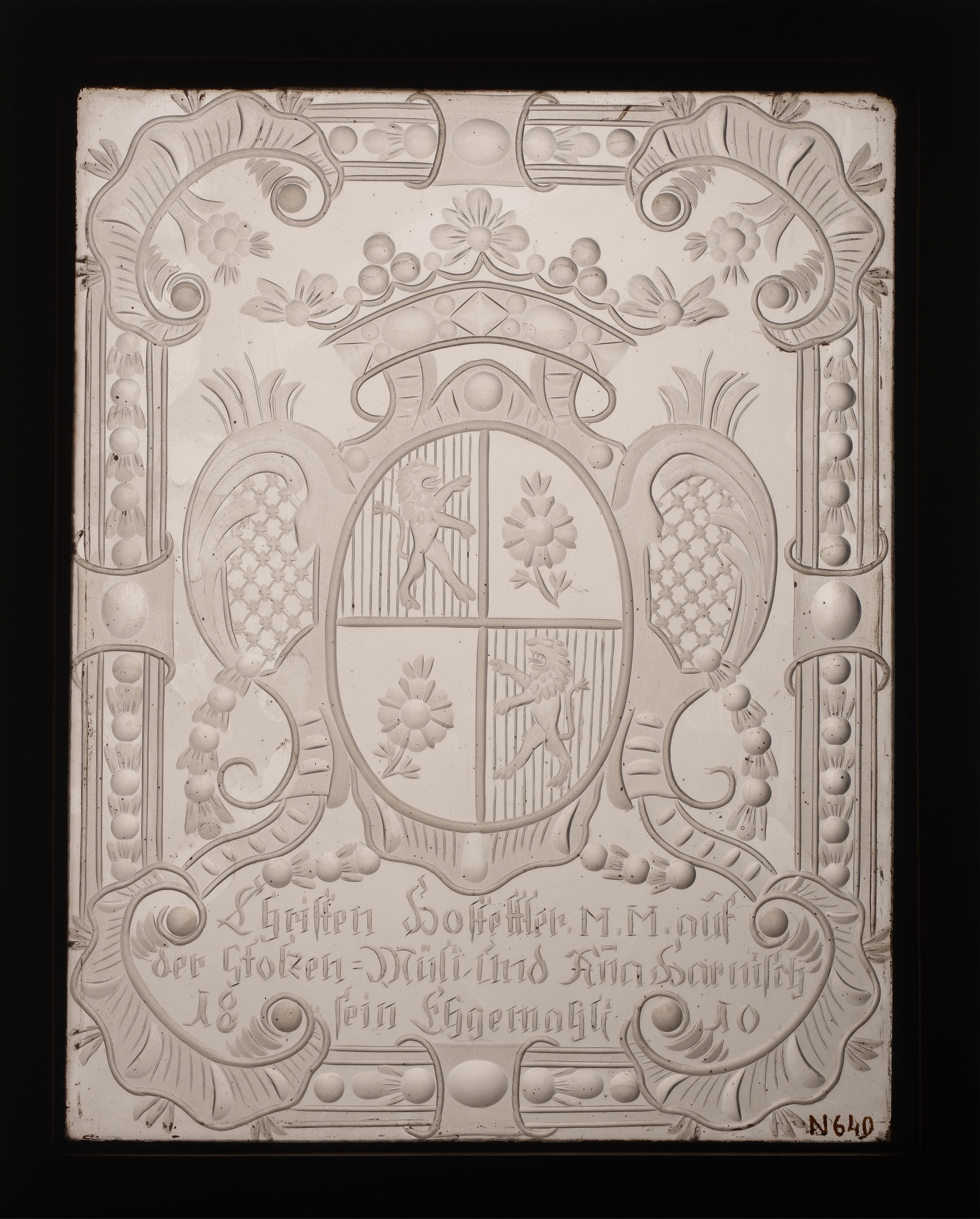 Dans le sillage de la prospérité économique que connaît la campagne bernoise et ses habitants au cours du XVIIIe siècle, cette nouvelle forme de vitrail venue de Bohème ou de Silésie se développe, attestant de la richesse de leur propriétaire (Paravicini-Stähelin, p. VIII). Ronds, ovales ou rectangulaires, ces panneaux gravés correspondent aux envies de lumière et de clarté dans les intérieurs du XVIIIe siècle. Ils sont élégamment et sobrement ornés d’inscriptions des donateurs, de citations bibliques, d’écus armoriés et d’ornements, parfois rehaussés à la grisaille (Rutsch, 1947, p. 5). Cet art populaire a décliné dès le XIXe siècle, dans un contexte de troubles politiques et d’essor croissant de l’industrie (Rutsch, 1947, p. 4).
