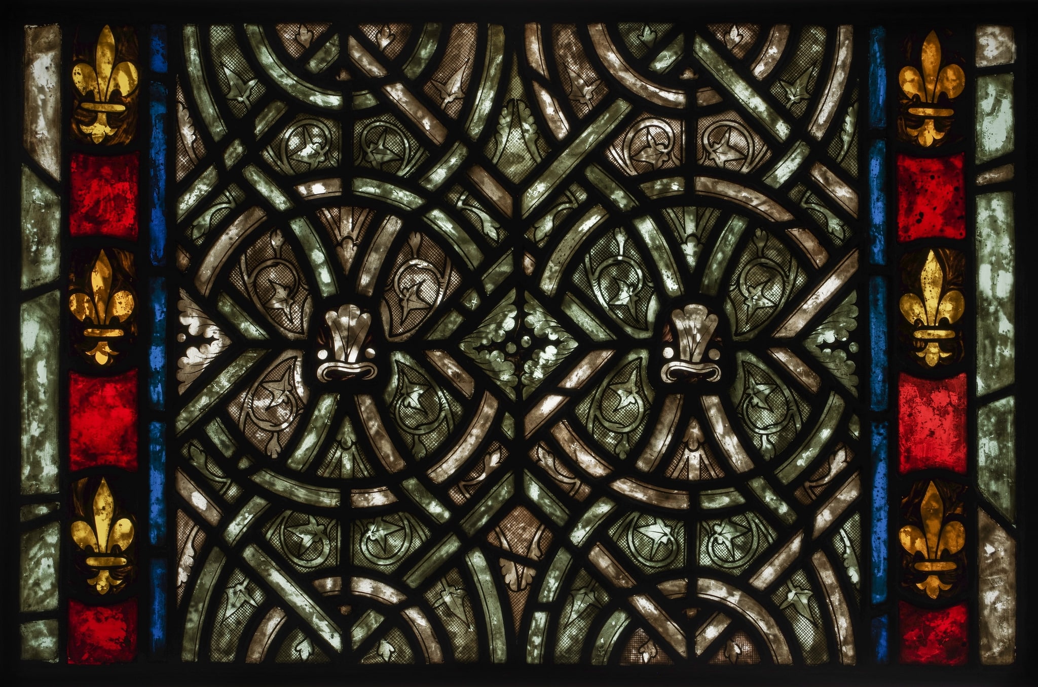 Pour ce panneau ornemental, Champigneulle imagine des motifs dans l’esprit des ornements dessinés à la grisaille sur les vitraux du Moyen Age, dès le XIIIe siècle. Il a appliqué sur le revers et l’avers du vitrail un traitement de surface à l’aspect dépoli sur l’ensemble des verres neufs, cette couche de peinture permettant de donner un aspect vieilli et moins transparent aux verres modernes (Trichereau et Loisel, 2017, p. 16). Cette technique, que le verrier Louis Ottin appelle dans son ouvrage “L'art de faire un vitrail” des « salissures » (Ottin, [1892?], p. 41-43), se pratique dès le XIIIe siècle.
