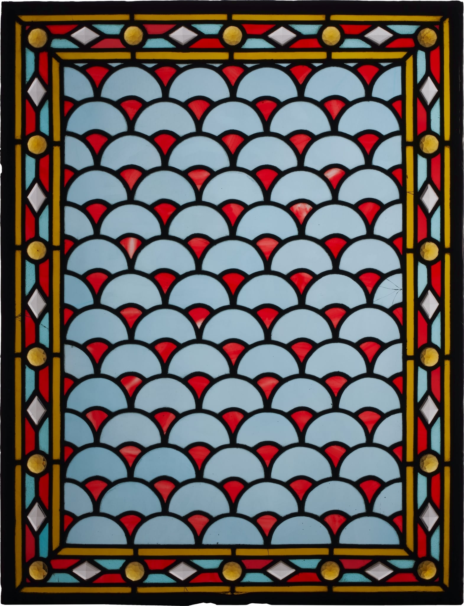 Ce vitrail, essentiellement de pleine couleur en verre cathédrale et à motif d’écailles, joue sur l’alternance de deux couleurs (bleu et rouge) pour apporter une certaine dynamique à la composition. La bordure est ornée de cabochons en forme de fleur et de gemmes losangés, apportant une pointe de préciosité, rehaussée par les deux filets dorés encadrant la bordure.