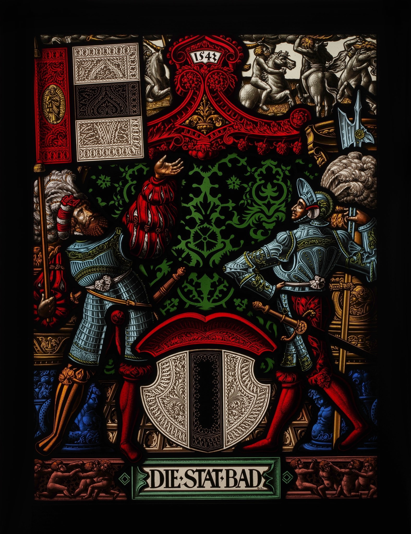 Sur un fond damassé vert et devant un sol carrelé rose, se tiennent, entre deux piliers soutenant un arc en volutes rouge, deux soldats encadrant les armoiries de la ville de Baden. A gauche, un hallebardier en pied, vêtu d’une demi-armure et coiffé d’un chapeau à plumes, tient dans sa main l’étendard de la ville sur la bande rouge duquel figure la Vierge. A droite, un hallebardier, portant également une demi-armure et une épée à sa ceinture, est coiffé d’un casque à plumes. Au-dessus de l’arc, des hommes nus chevauchant leur monture, s’affrontent à coups de gourdin sous un ciel menaçant. En bas, sur un soubassement, des putti se battent de part et d’autre d’un cartouche.