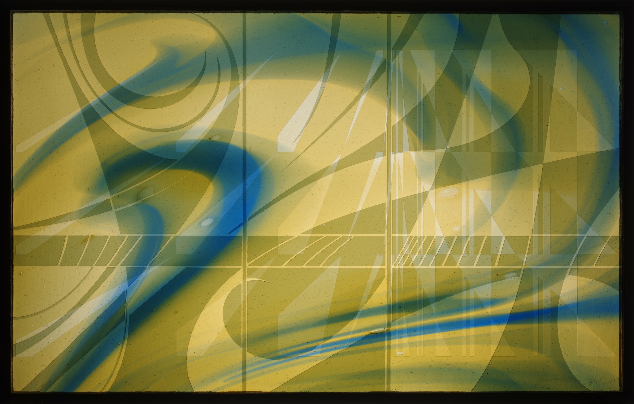 La strate du haut est composée d’un verre plaqué dans les tons jaunes, dont la couche supérieure est gravée à l’acide révélant des lignes verticales et diagonales ainsi que des volutes apparaissant sur un verre blanc. La couche inférieure est constituée d’un verre jaune inséré de moirures bleues qui forment des volutes. La superposition de ces deux couches apportent une forme de tridimensionnalité à l’oeuvre.