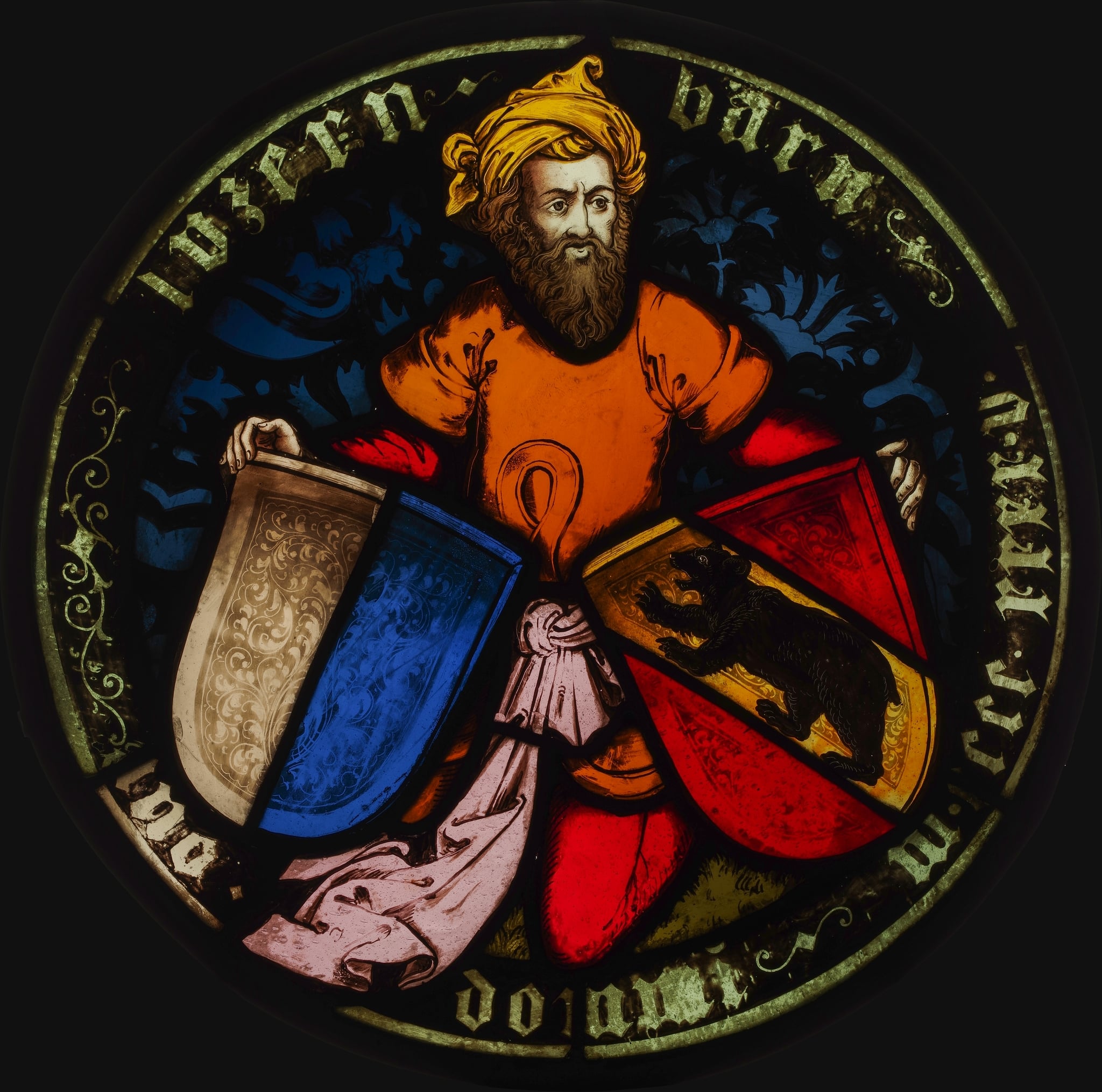 Ce rondel présente sur un fond damassé bleu un homme barbu et enturbanné agenouillé, vêtu d’une tunique orange et d’un pantalon rouge avec un large foulard rose attaché à sa taille avec un gros noeud. Il tient de sa main droite les armoiries du canton de Lucerne et de l’autre celles du canton de Berne. Une inscription se déploie sur la bordure du vitrail.