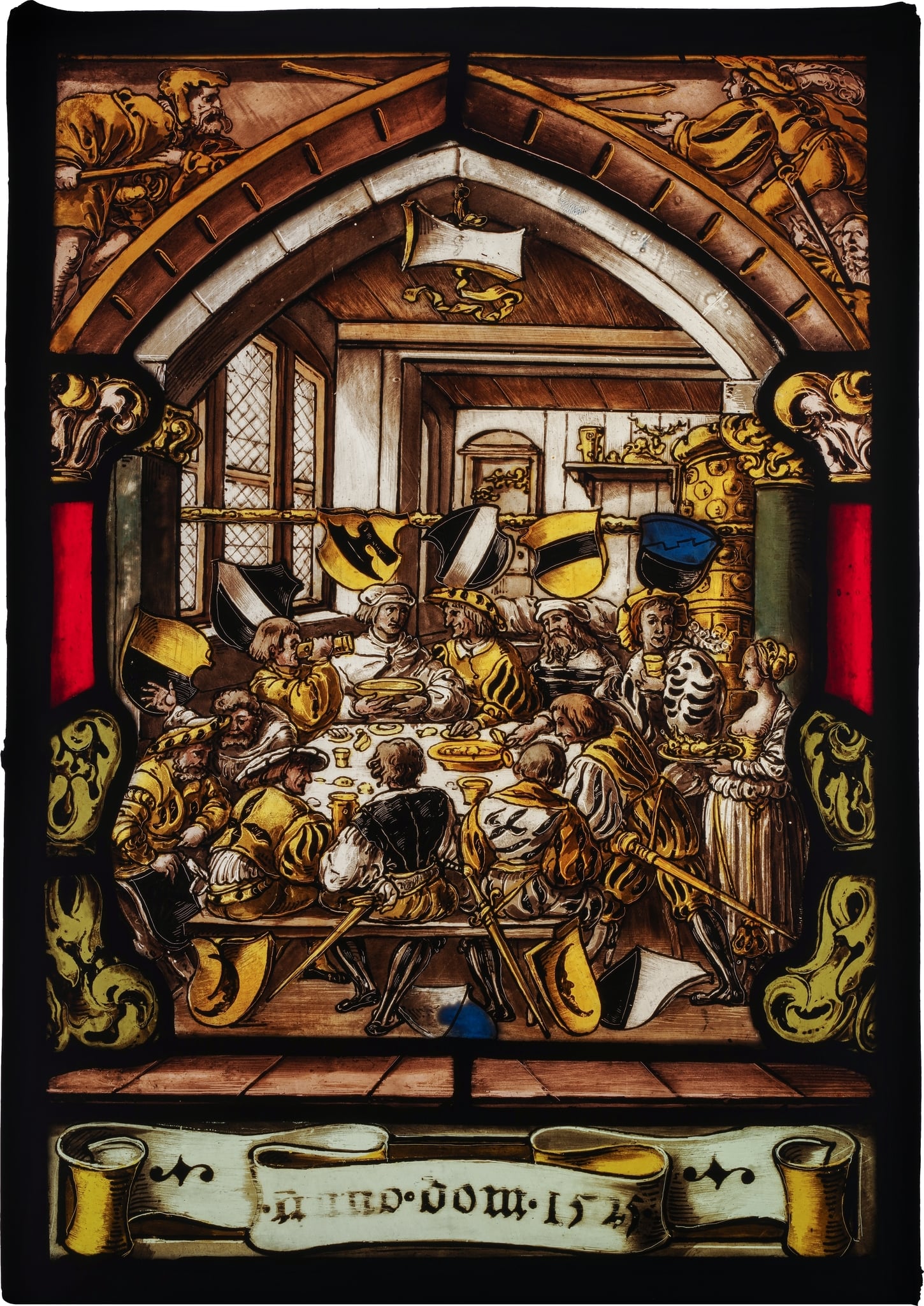 Ce vitrail monolithe présente au centre une scène de convivialité avec onze hommes, membres d’une même corporation, réunis autour d’une grande table richement garnie. Ils boivent et discutent les uns avec les autres. A droite, une servante vêtue d’un longue robe blanche et d’un corsage jaune d’où déborde sa poitrine, vient apporter un plat garni d’un poulet. L’un des convives, debout à sa droite, la regarde, le sourire aux lèvres. Des grandes fenêtres à losanges ornent le mur gauche de la salle de la guilde. Les blasons des différents membres sont disposés autour de la tablée. La scène est encadrée par des doubles piliers rouges et verts aux chapiteaux corinthiens soutenant un arc brisé. Au-dessus, dans les écoinçons, deux soldats se font face et se battent à coups de lance. En bas au premier plan, une inscription est insérée dans un cartouche avec la date “1525”.