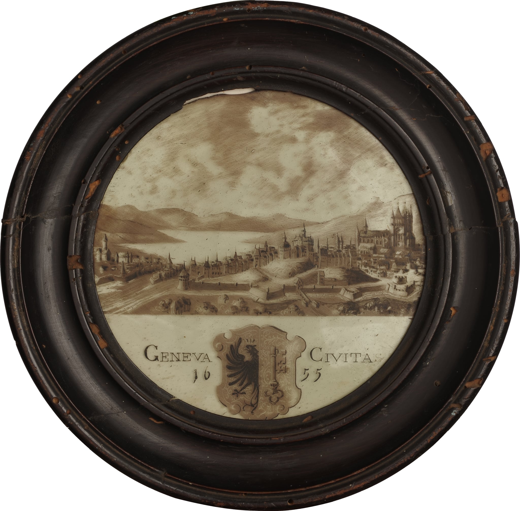 Médaillon monolithe circulaire représentant dans la partie supérieure une vue de la ville fortifiée de Genève depuis Plainpalais, en direction du nord-est. Au premier plan figure à gauche le Rhône et le quartier et l’église de Saint-Gervais (rive droite), relié par le pont de l’Ile à la ville basse et la ville haute (rive gauche) encerclées par les bastions. De gauche à droite se trouvent entre autres le clocher de Saint-Germain, les deux tours de l’ancien Hôtel de ville et la cathédrale Saint-Pierre de Genève. L’arrière-plan montre le Léman et les paysages montagneux qui bordent la cité. Dans la partie inférieure figure un écusson aux armes de Genève avec de part et d’autre une inscription en latin.