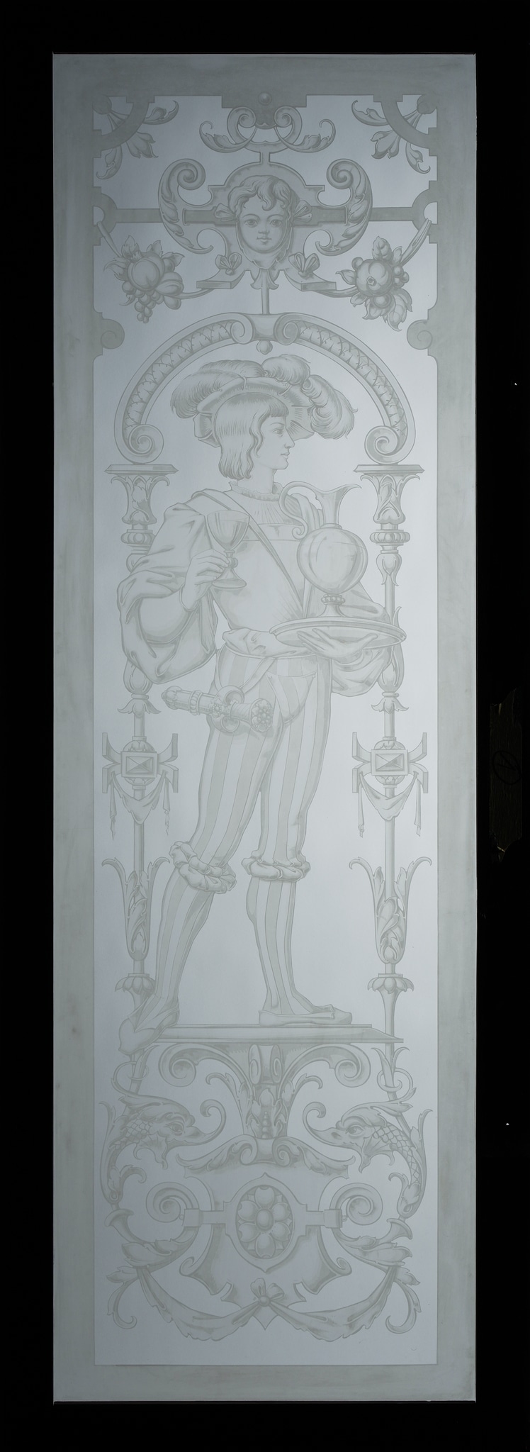 Le présent panneau, datant de la fin du XIXe siècle, découle de cette tradition. Beaucoup plus grand que les vitraux du XVIIIe siècle, il devait probablement orner une fenêtre ou l’encadrement d’une entrée. Plusieurs ateliers actifs à la fin du XIXe siècle en Suisse proposaient ce genre de produits, tel l’atelier fribourgeois Kirsch & Fleckner qui sur son papier à en-tête faisait, à côté du traditionnel vitrail au plomb, la promotion pour la “gravure sur verre blanc ou coloré pour vestibules, lanternes, devantures ainsi que sur glaces” (Kirsch & Fleckner, 1895). Ce fut également le cas de l’atelier Chiara à Lausanne qui proposait ce genre de services encore au milieu des années 1920 (Hostettler, 2001b, p. 53). Il existait même dans la capitale vaudoise, une manufacture de verres gravés, active dès 1897 (Hostettler, 2001a, p. 44).