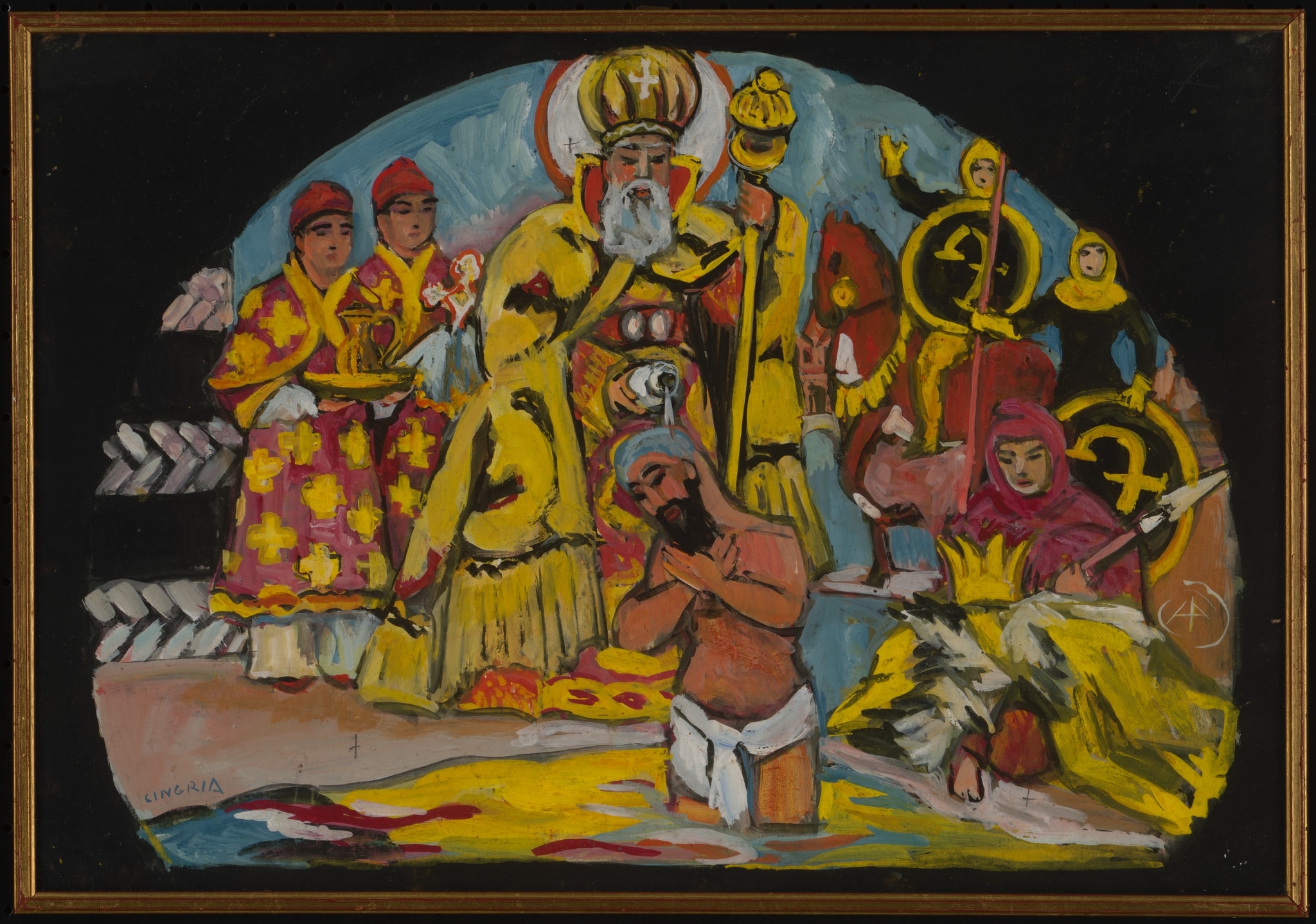 Alexandre CINGRIA. – Maquette originale du vitrail placé dans la nouvelle / église d’Ependes et offert par Mme Philipposian, mère de Mme Jean d’Amman. / (Baptême du roi Tigrane d’Arménie par St. Grégoire l’Illuminateur) (inscription manuscrite au dos du cadre au verso)