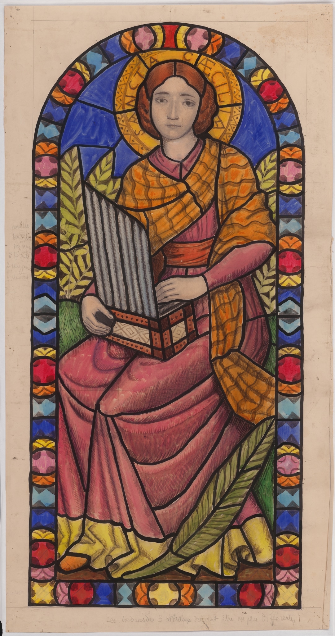 Ce carton pour un vitrail en plein cintre illustre sainte Cécile, assise légèrement tournée vers la gauche. Elle tient sur ses genoux un orgue portatif dont elle joue. Vêtue d’une robe rose à bordure blanche et ceinturée, ses épaules sont couvertes d’une étole moutarde à carreaux. A ses pieds figure la palme de son martyre. A l’arrière-plan, un buisson composé de longs branchages évoque un environnement naturel.