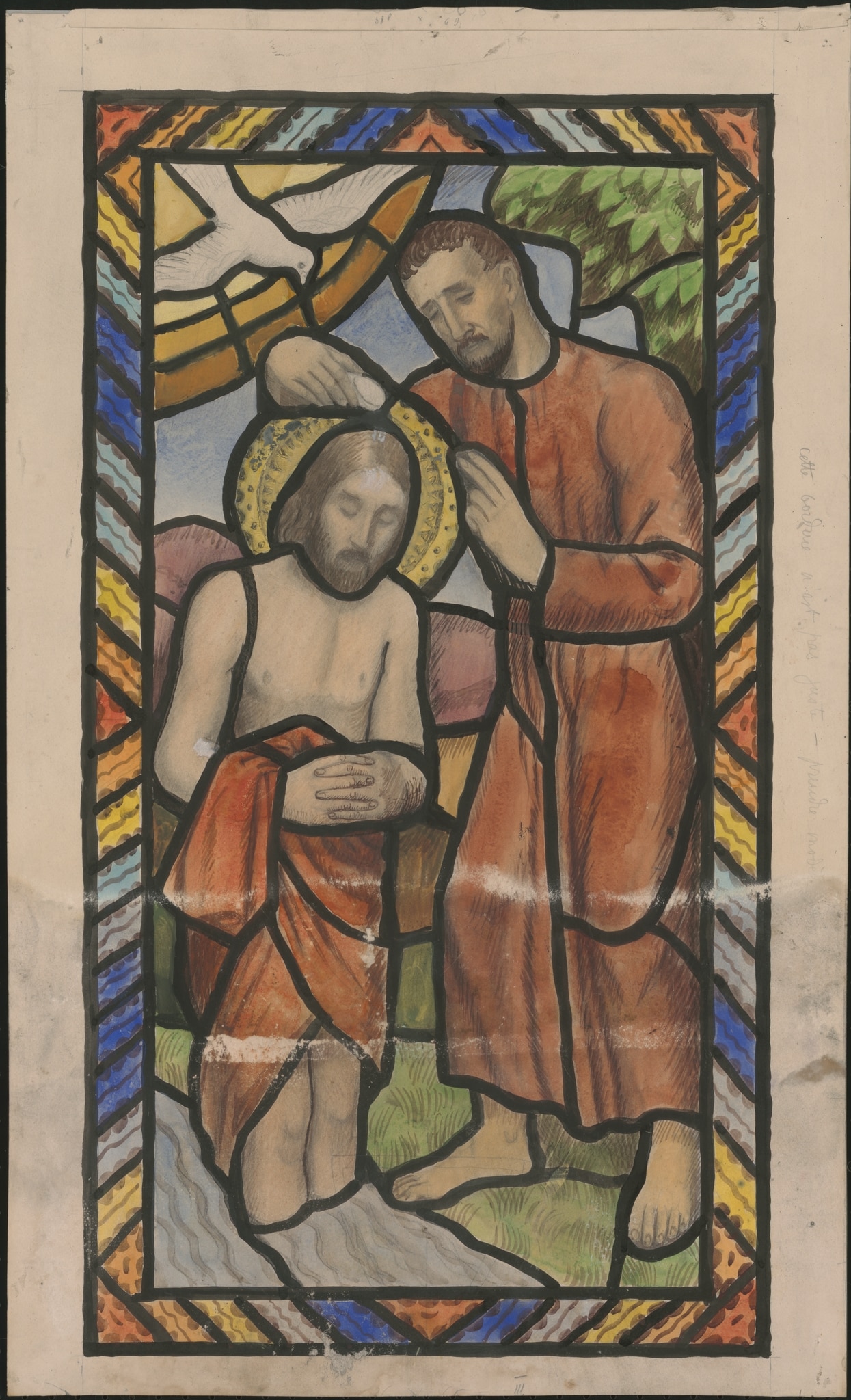 Ce carton illustre le Baptême du Christ. A gauche, le Christ nimbé et torse nu, est debout dans les eaux du Jourdain jusqu’aux mollets. La tête baissée et les mains jointes, il reçoit le baptême de Jean-Baptiste lui versant de l’eau sur la tête avec un coquillage. De sa main gauche, il le bénit. Au-dessus du Christ, la colombe du Saint-Esprit descend sur lui alors qu’à droite apparaît un arbre.