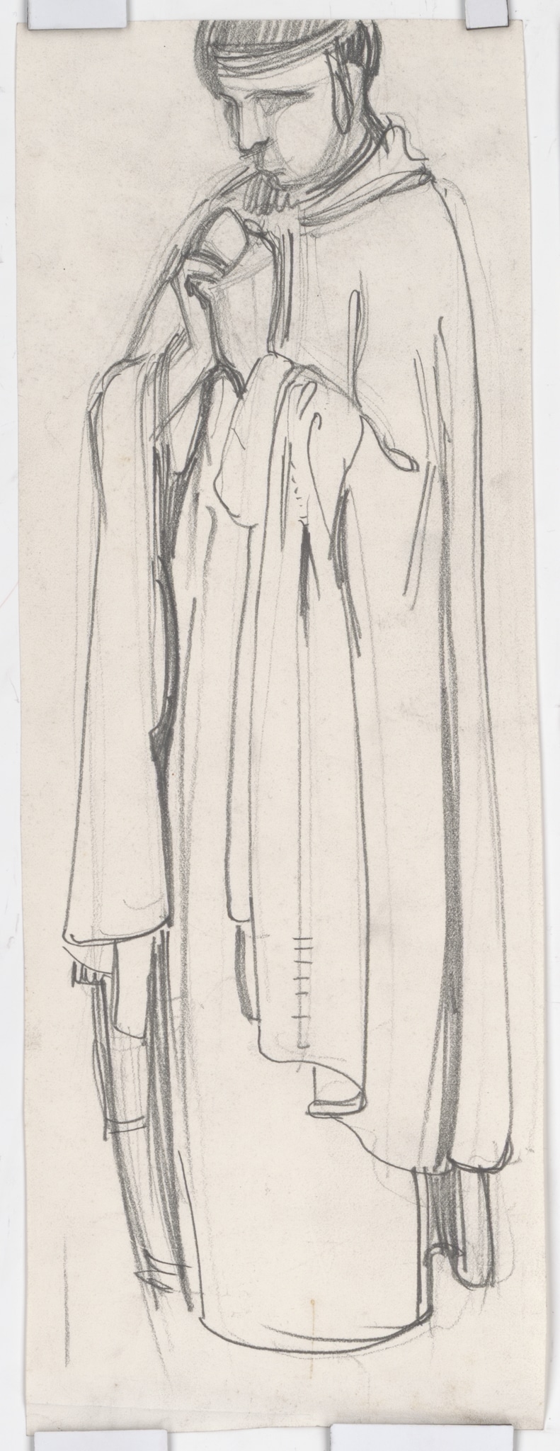 Plus de 70 projets peuvent être rattachés aux vitraux de Saint-Paul, et 51 aux trois vitraux des bas-côtés, mais l’ensemble n’est probablement pas complet. Pour le vitrail de sainte Cécile, il existe 17 oeuvres graphiques dont sept concernent la scène du milieu du vitrail (MP_01.04 ; MP_01.05 ; MP_01.06 ; MP_01.07 ; MP_01.08 ; MP_01.09 ; MP_01.10). La plupart d'entre elles, à l'instar de celle-ci, sont des esquisses dans lesquelles l'artiste établit les grandes lignes de sa composition, étudiant l’allure et la position de ses personnages, ici probablement l'un des spectateurs situés à droite de sainte Cécile (il ressemble également à la figure de Valérien dans la scène supérieure).
