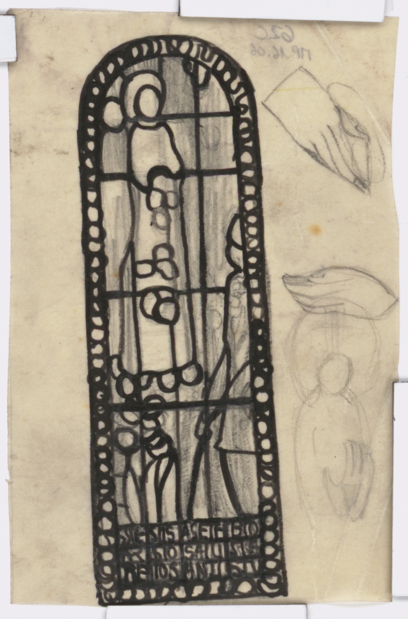 Cette esquisse est un travail préparatoire pour un vitrail consacré à sainte Élisabeth de Hongrie, réalisé en 1915 par l’artiste genevois Marcel Poncet (GSL_561). Il a été posé en 1941 dans la salle paroissiale attenante à la chapelle catholique d’Aubonne, où il se trouve encore actuellement. Ce vitrail se trouvait à l’origine dans la maison Maurer, espace utilisé comme lieu de culte par la communauté catholique d’Aubonne, avant d’être déplacé à son emplacement actuel lors la construction de la chapelle en 1939-1941 par les architectes François de Reynold et Albert Cingria (Lincio, 2002, p. 18).