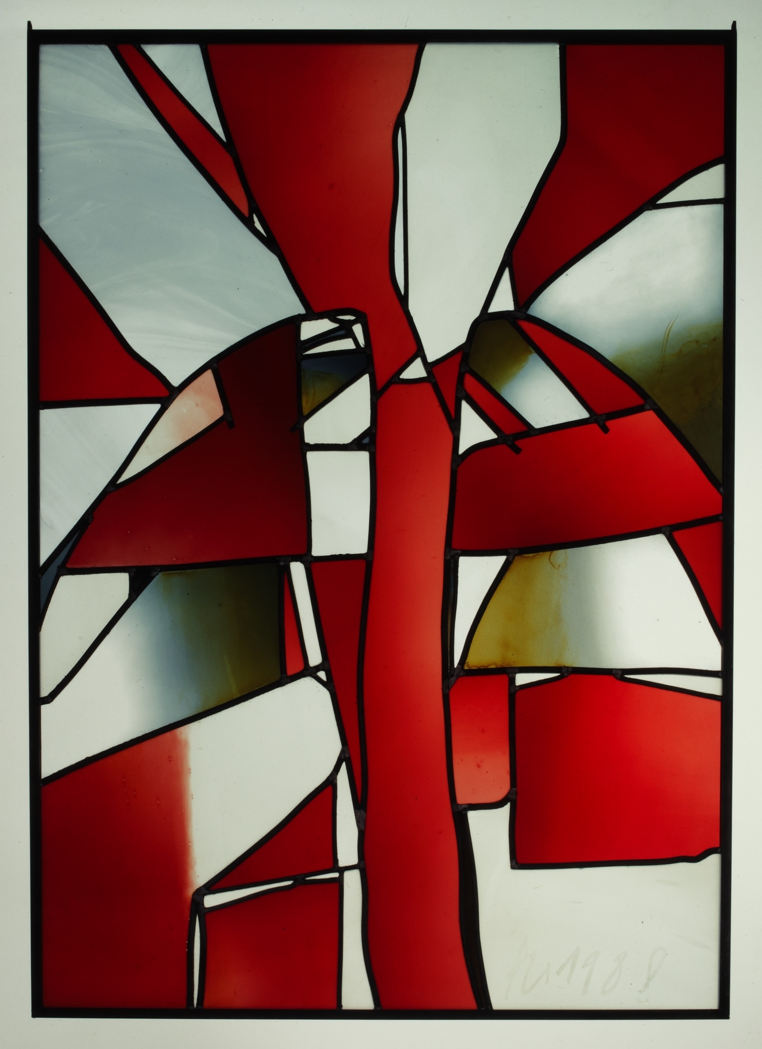 Composition de grandes pièces de verre aux couleurs du canton de Soleure (rouge et blanc) représentant un arbre de vie de manière très stylisée.