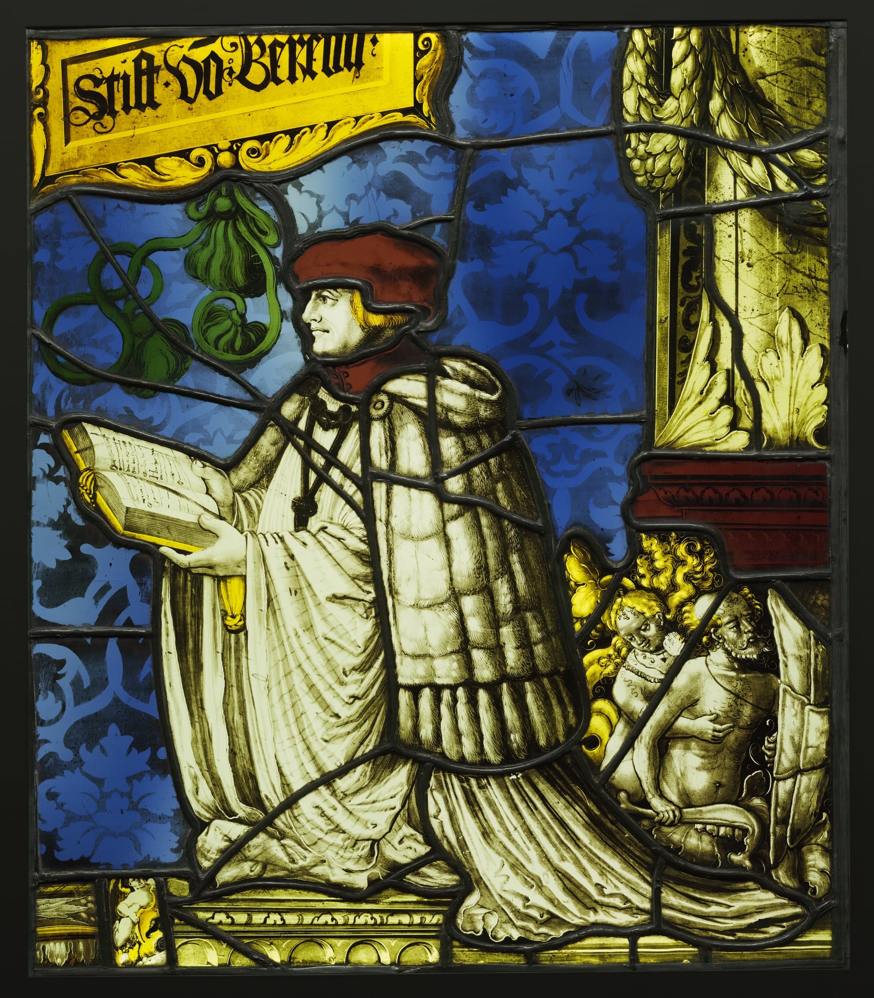 Holbein was immensely influential for the development of glass panting in Switzerland. Some of Holbein’s own panels survive, most notably a panel of the sainted Emperor Henry II with the arms of Basel from the cloister of the Cistercian Abbey of Wettingen of 1522 (West IVb; Hoegger, 2002, pp. 33–36, 121, 312–14; Schmidt, & Reinhardt, 1960, p. 181, no. 151, fig. 59). The artist’s bold concepts of monumental composition and ability to fuse late-medieval surface design with Renaissance three-dimensional space made him, like Albrecht Dürer, a key figure in the transformation of northern artistic thinking (Ganz, 1903, pp. 197–207; Ganz, 1937). The heavy column with its leafy swags stands out in the Getty panel. A wash drawing by Holbein showing the Ecce Homo, about 1528, part of a series of ten designs for stained glass depicting the Passion of Christ, displays similar composite columns with three- dimensional acanthus leaves (Kunstmuseum, Basel; Butts, & Hendrix, 2000, pp. 304–309, nos. 146–50). Details such as the soft cap, prominent nose and soft jowl link the panel to Holbein’s drawing, Portrait of a Scholar or Cleric, about 1532–1535 (J. Paul Getty Museum 84.GG.93). Both figures seem caught in moment of peaceful refection, yet personality is still visible through delicate treatment of features. Even when executed by the hand of the anonymous glass painter, the panel evokes Holbein’s fusion of Italianate volumetric presence and northern tactile sensibilities. Note, in particular, the detail of the canon’s furry cape, the almuce that was worn as a choir vestment. A date of about 1520 is based on the artist’s work in Basel at the time. The Premonstratensian abbey church of Rot was rebuilt by 1509 but gifts of leaded and painted windows often came considerably after the architecture.