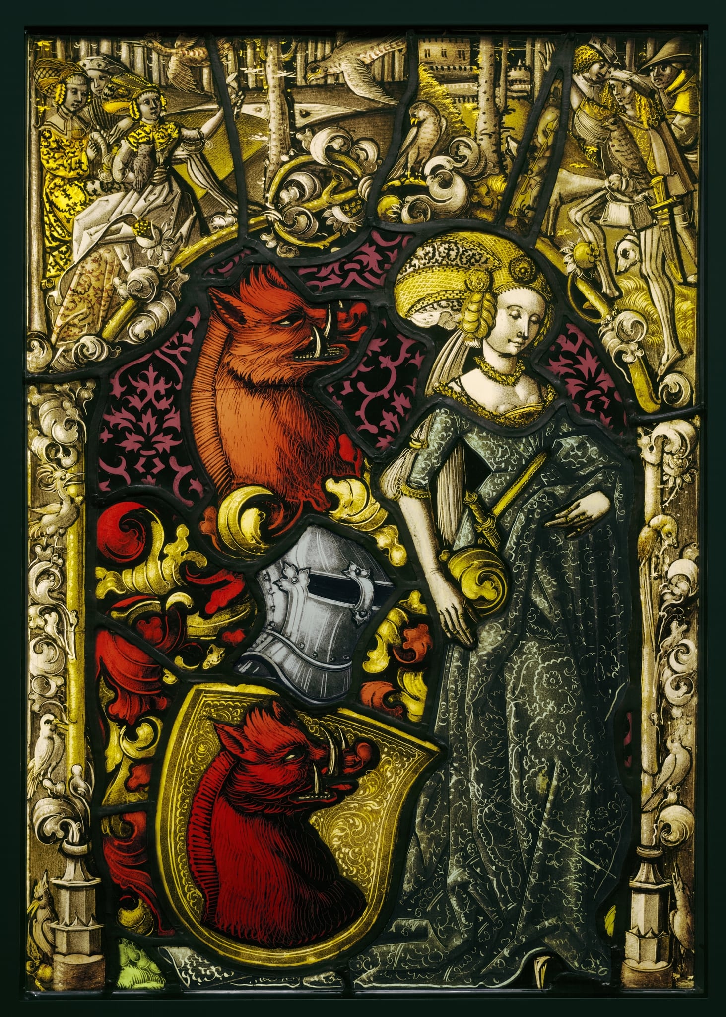 Dominated by red and gold, the panel exhibits a warm tonality. The intense red of the damask background, heraldic images, and mantling is balanced by the light blue of the helm and the dress of the supporter. This dramatic contrast of deep colors is counterbalanced by the visual complexity of the painted surfaces of the uncolored glass. The panel is composed of pot metal and uncolored glass with silver stain and vitreous paint. Flashed and abraded red is used to create the red and gold of the silhouetted boar’s heads and mantling in the arms. Surface paint is unusually dense, yet adapted to the vitality of the colors and translucency of the glass. The backpainting, although authentic, parallels a modern, gestural expression. Bold, loose strokes appear throughout, particularly effective in adding depth to the blue-green damask dress of the woman and the shading of the right side of the boar’s heads.