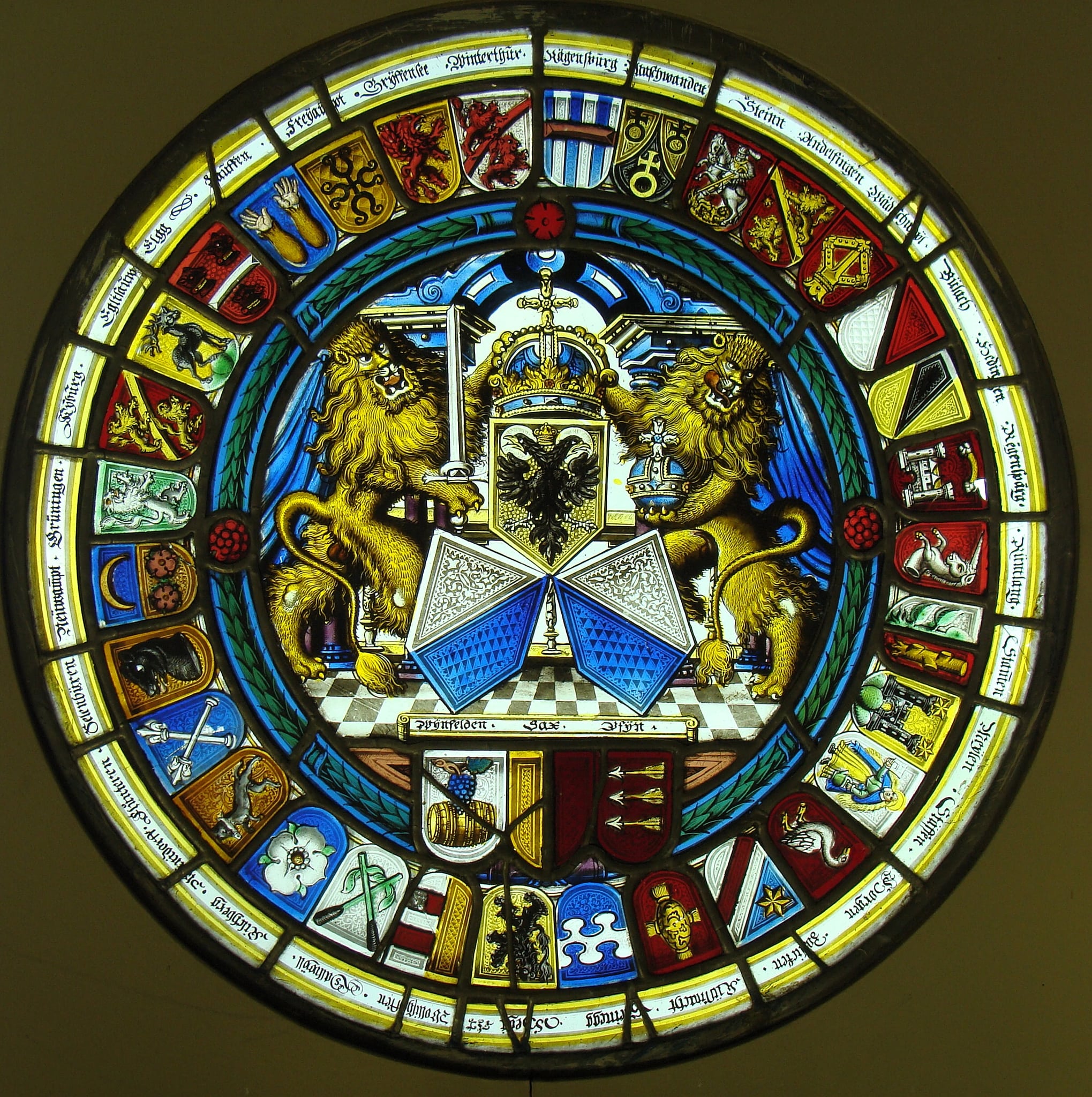 Zurich: Per pale argent and azure twice repeated, or a double-headed eagle displayed sable crowned beaked and armed or (the Empire); crest: an Imperial crown proper; supporters, two lions rampant guardant or holding in their dexter and sinister paws the Imperial sword and orb.
