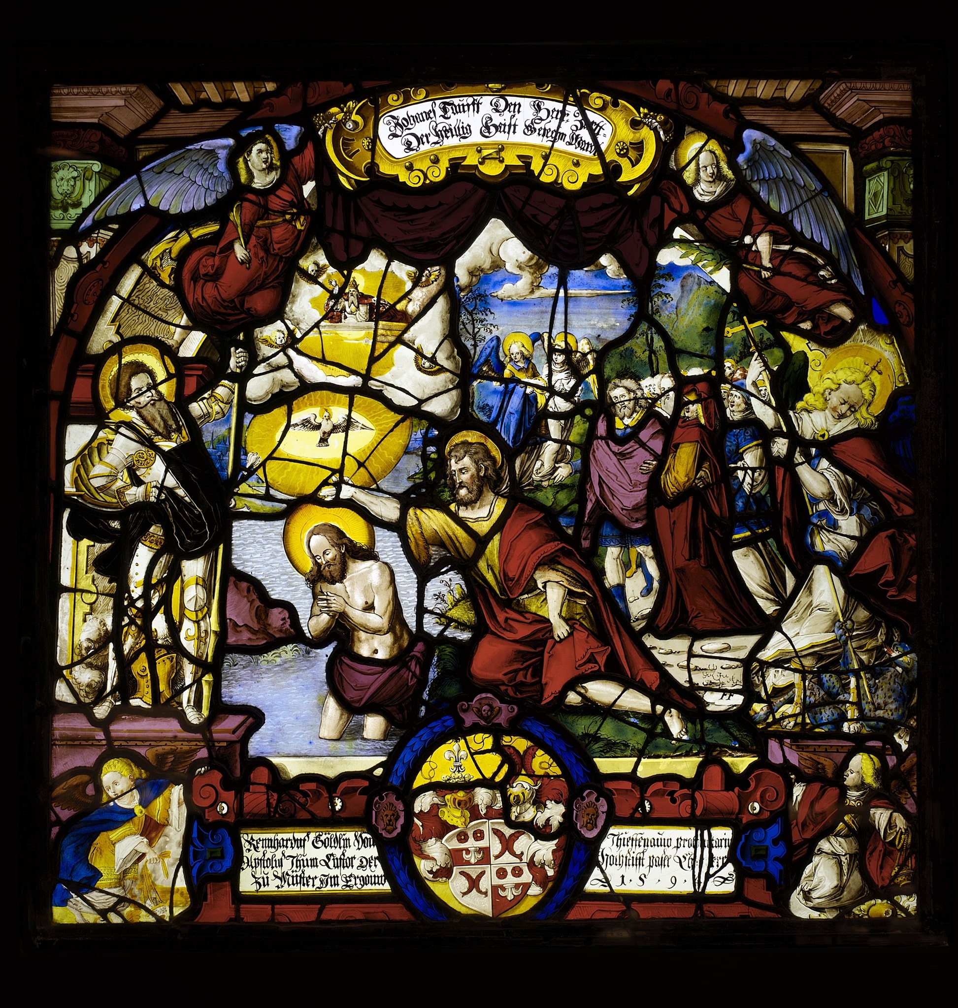 Johanes Taūfft Den Herr Zartt/ Der heillig Geist Geseehn Wardt (Above the scene. John lovingly baptizes the Lord. The Holy Spirit is seen.)