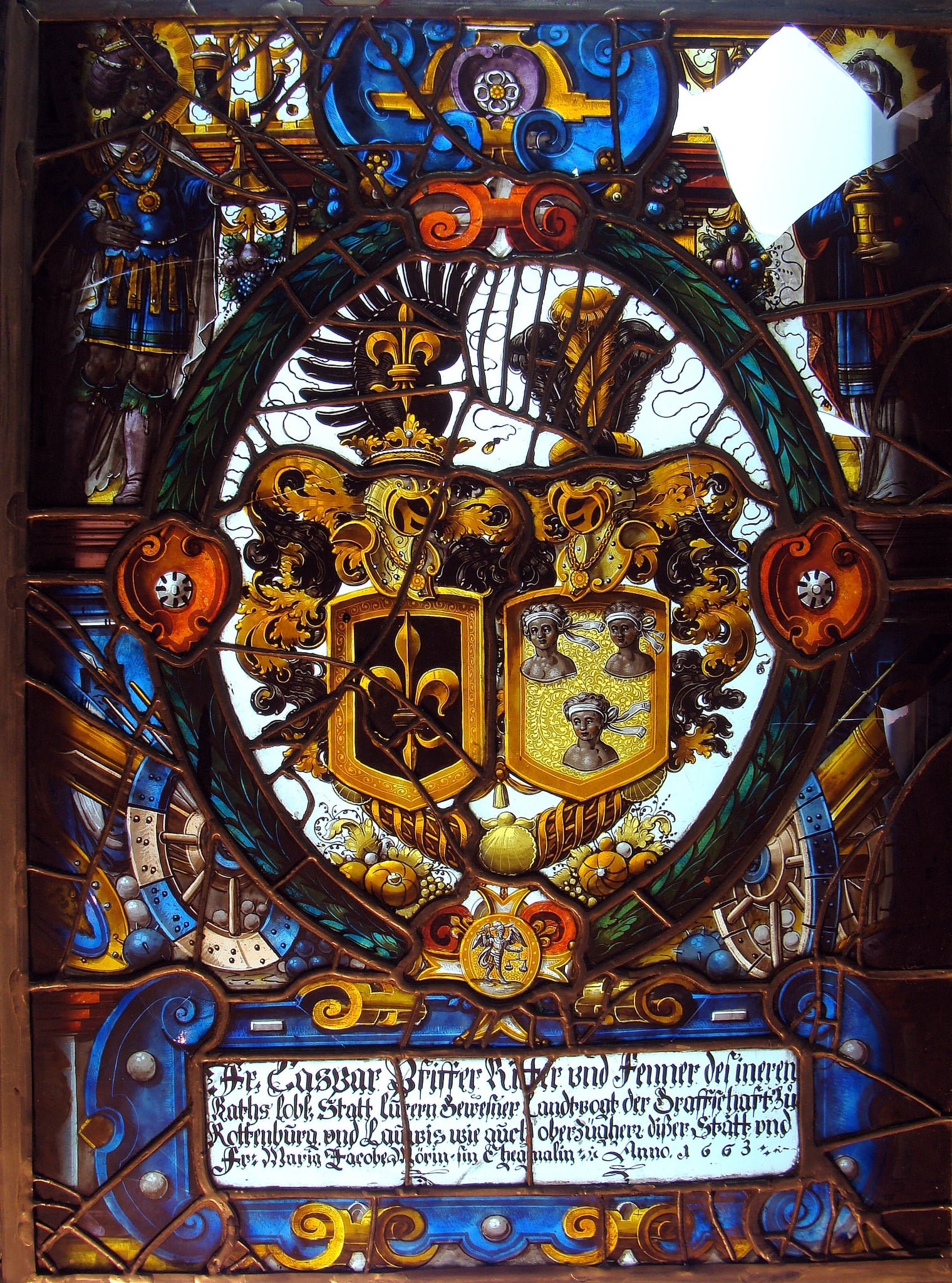 (Mr. Caspar Pfyffer Knight and Military Commander of the Inner Council of the praiseworthy city of Lucerne. Former district governor of the county of Rotenburg [canton Lucerne] and Lugano [canton Tessin] and in Lucerne, the armory manager and Mrs. Maria Jacobea Mohr, his wedded wife, in the year 1663).