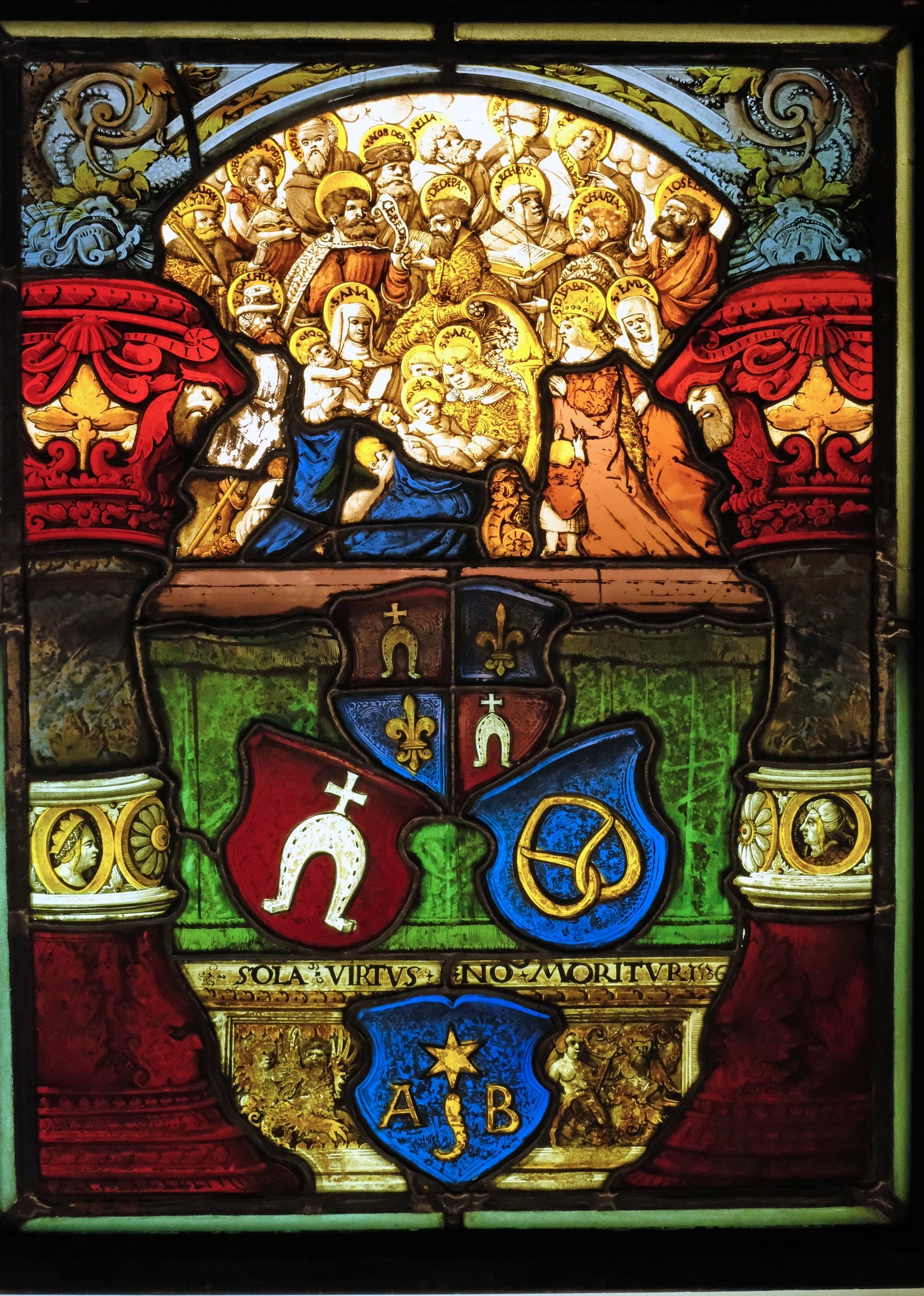 A dense collection of images of saints, all labeled, appears in the upper half of the panel. Below are three coats of arms in a pyramid form. The composition of the panel, and its attraction rests on its highly ornate architectural borders and background. Massive baroque columns of red and green pot metal glass frame the panel. Above their broad, foliate bases, a band of uncolored glass with silver stain and enamel shows male and female heads in profile. Their ornate capital displays yellow foliage on the front and male harpies in profile flanking the interior scene. At the top, surrounding the imagery, is a blue arch with silver-stained green intertwining vines and leaves. In the center bottom, a relief of harpies, putti, and other mythological figures frame the blue coat of arms. Above that, a bright green ground silhouettes the blue and red arms.