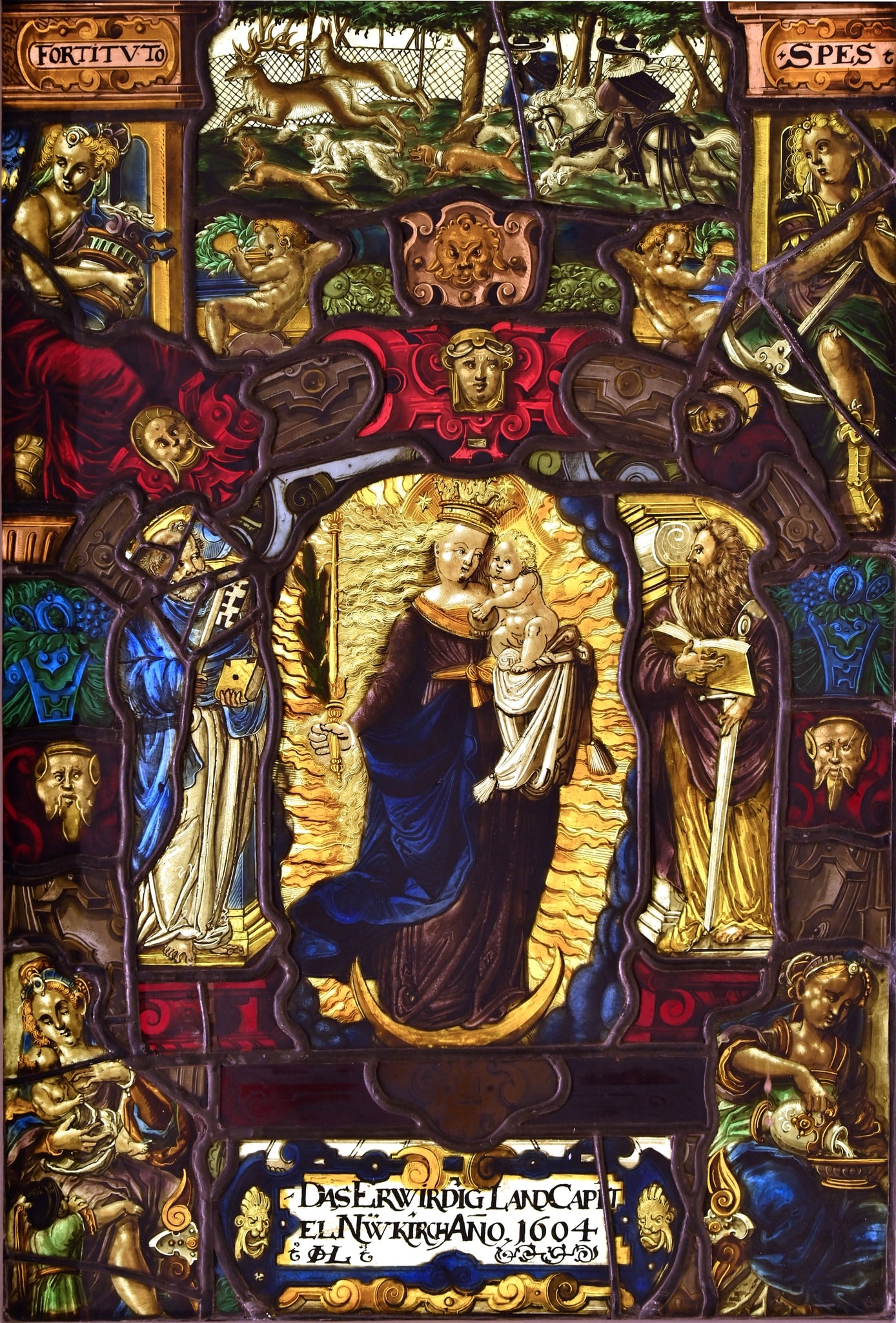 Albrecht Dürer’s engraving of the Virgin on the Crescent with Scepter and Starry Crown (1516; Metropolitan Museum of Art, 19.73.39) shows the image of Mary, Queen of Heaven fused with Mary the loving mother holding her chubby baby. The image was often represented in Swiss Renaissance windows. Twelve of the windows dating from 1520 through 1626 in Cloister Wettingen show variations (Hoegger, 2002, pp. 82, 89, 94, 99, 113, 133, 136, 139, 156, 178, 190, 198, 263, 271–72, 278, 284–85, 302–304, 326, 329–30, 332–34, 355–56, 377–78, 391–92, 400–401). Wetting is in the vicinity (40 kilometers) from Neunkirch. The same type appears in the glazing of the Cloister of Muri, twice associated arms of with abbots, Joachim Eichorn, abbot of Einsiedeln given in 1557, and Jodok Krämer, abbot of Engelberg, given in 1564. The Standesscheibe of Baden, shows the image on the banners of the city (Hasler, 2002a, pp. 48–49, 80–81, 88–90, 116, 119, 144–45, 182–83, 194–95, 234–35).