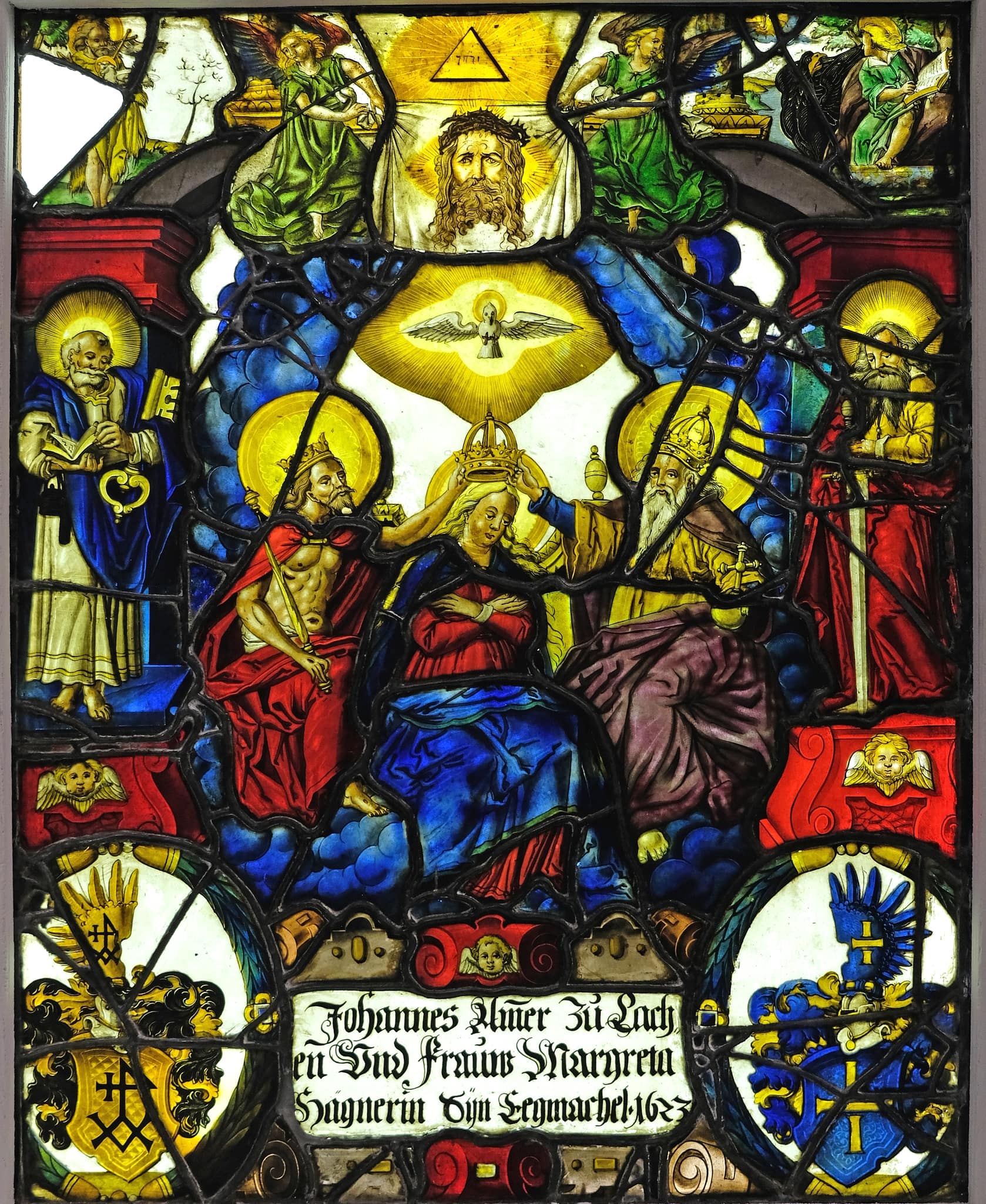 The window is an articulate representation of Catholic piety. St. Peter in the honored position to dexter (the viewer’s left) and St. Paul, refer to the authority of the Church as centered in Rome. The juxtaposition of John the Baptist and John the Evangelist at the top of the panel is quite similar to the composition used for a panel dated 1599 by the Winterthur artist Tobais Erhart an offered by Prior Johannes Eckstein of the Monastery of Ittingen (TG_73). The Easter antiphon: Regina caeli, laetare, alleluia; Quia quem meruisti portare, alleluia, Resurrexit, sicut dixit, alleluia: (Queen of heaven, rejoice, alleluia; The Son you merited to bear, alleluia; Has risen as he said, alleluia) appears in an antiphonary of about 1200 from St. Peter’s, Rome (Breitschneider, 1997, p. 1358). The composition of the image of the Coronation of the Virgin by the Trinity depends on the precedent set by Abrecht Dürer’s 1510 woodcut (Albrecht Dürer, The Assumption and Coronation of the Virgin, from The Life of the Virgin, The Metropolitan Museum of Art). The model was certainly well known; a closer match appears in a window given in 1573 to the Cloister of Muri. The donor Hans Müller commissioned the work from an unidentified Zurich glass painter (Hasler, 2002, pp. 96, 98, 207–208). The veil of St. Veronica, believed to have been imprinted with the image of Christ when he wiped his face just before his death, was one of the most venerated relics in St. Peter’s Basilica. The popularity of the relic developed in the Latin West after the conquest of Constantinople and plunder of its relics in 1204 during the Fourth Crusade (Wolf, 1997, pp. 153–79).