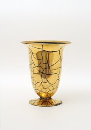 Le décor doré craquelé du vase présenté ici est emblématique de la Verrerie artistique, son apparition coïncidant avec la publication du catalogue de 1935. La qualité du craquelé – large et brillant – est caractéristique de l’après-guerre, alors que l’émail bleu utilisé précédemment n’était plus disponible (Walther, 2025, 65).