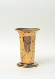 Verre vert, pied appliqué, revêtement émaillé bleu, recouvert de dorure. Les craquelures irrégulières apparaissent lors de la cuisson qui fixe le décor; forme: panse cylindrique