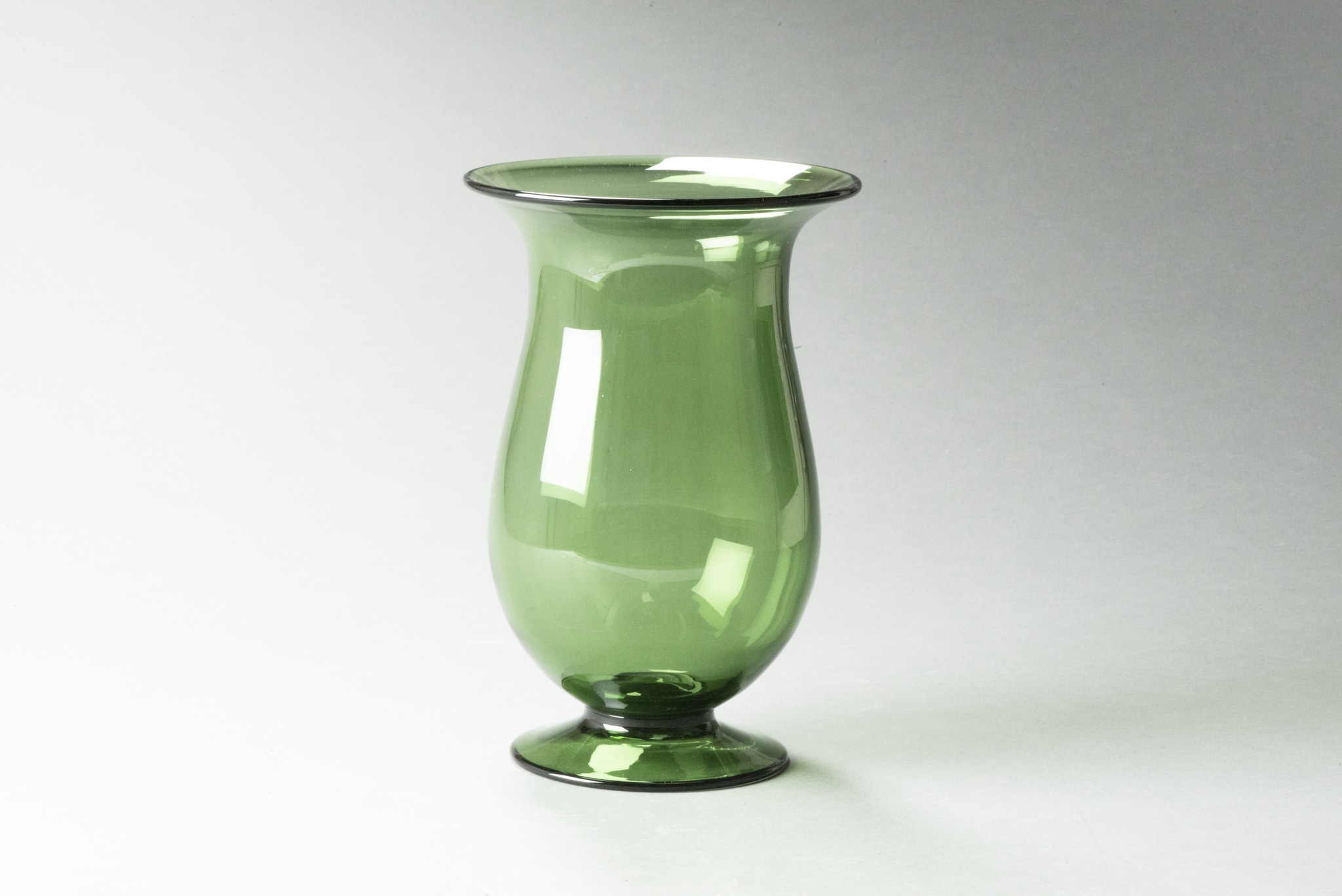 Ce modèle de vase (130) fut créé à une période précoce de la Verrerie artistique (1930-1964). Les sources dont nous disposons sont des catalogues de la Verrerie de St-Prex, certains inédits, tels que les albums noirs munis de photographies de vases, vraisemblablement utilisés par les représentants de 1931 à 1935, où ce modèle porte le no 118. Il est disponible en verre vert (H 14 à 27 cm), gravé à filet d’or (H 15 et 25 cm) ou givré recuit (H 16 et 18 cm) (Verreries de St-Prex, 1931). Ce modèle fait également partie de l’offre du premier catalogue de vente imprimé de 1935 (Verreries de St-Prex, 1935, 4, 14 et 16), où il est décliné en verre vert, argenté craquelé et émaillé noir.